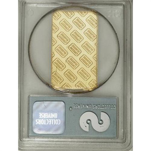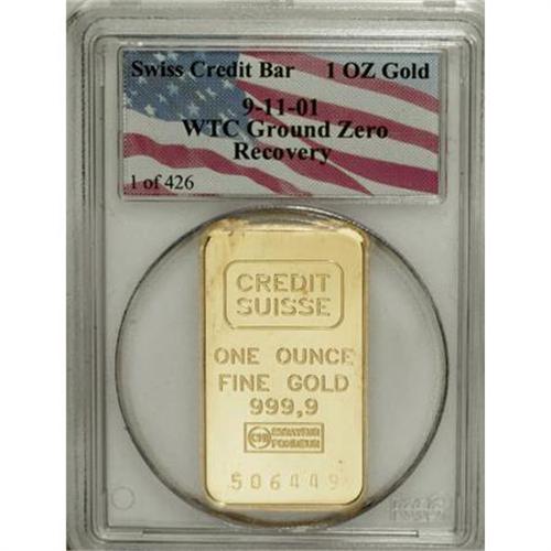<B>Gold One Ounce Swiss Credit Bar PCGS.</B></I> 9-11-01 World Trade Center Ground Zero Recovery.<BR><BR><b>Shipping:</b> Coins & Currency (<a target="_blank" href="http://www.heritageauctions.com/common/shipping.php">view shipping information</a>)