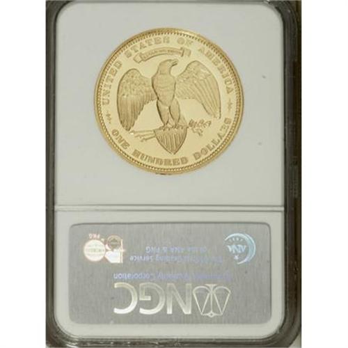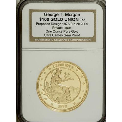 <B>"1876" $100 Gold Union "Restrike" Ultra Cameo Gem Proof NGC. </B></I>One ounce pure gold. Struck by the private New York Mint. #3 of 500 struck. An attractive cherry-wood presentation case is included.<BR><BR><b>Shipping:</b> Coins & Currency (<a target="_blank" href="http://www.heritageauctions.com/common/shipping.php">view shipping information</a>)