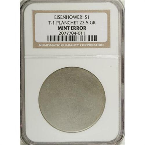 <B>Undated $1 Eisenhower Dollar Type One Planchet NGC.</B></I> 22.5 gm. The rims are not raised on this Type One planchet, since it never made a pass through the upset mill. Faint powder-blue, gold, and tan toning. One side of the planchet has several light to moderate pinscratches.<BR><BR><b>Shipping:</b> Coins & Currency (<a target="_blank" href="http://www.heritageauctions.com/common/shipping.php">view shipping information</a>)