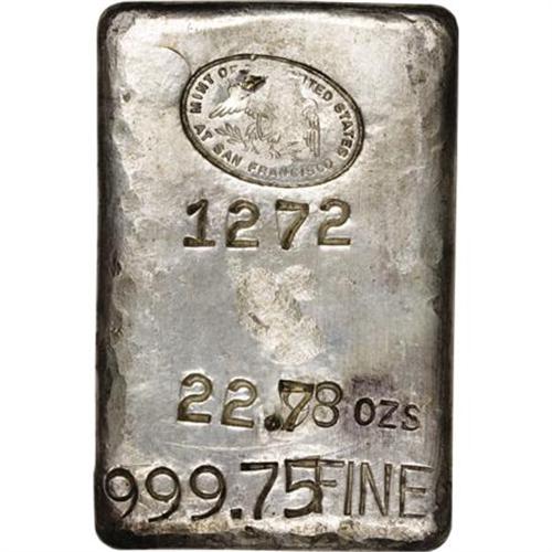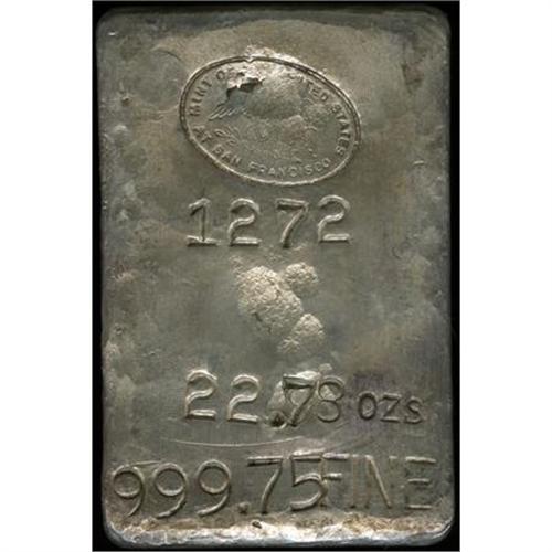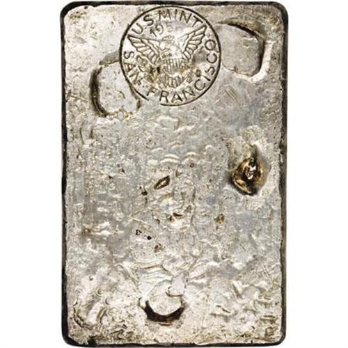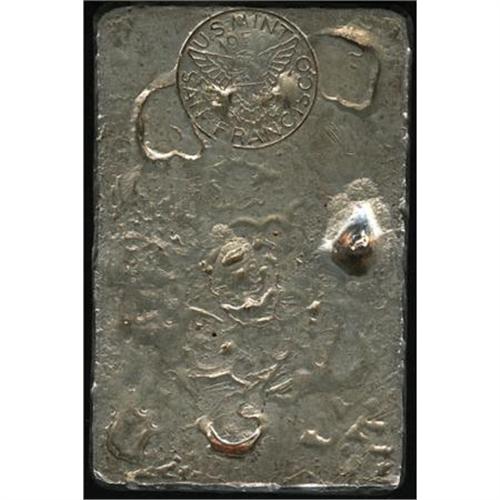 <B>1956 MS San Francisco Mint Silver Ingot.</B></I> A silver slab of considerable size and heft. The top side has the oval imprint of the San Francisco Mint, followed by 1272 on the next line, then 22.78 OZS, and 999.75 FINE on the lowest line. Batch number (?) 164 is imprinted on the short lower side. The back side has the circular imprint of the mint and the date 1956. A number of gas bubbles have left depressions on each side, but more naturally are on the back side.<BR><BR><b>Shipping:</b> Coins & Currency (<a target="_blank" href="http://www.heritageauctions.com/common/shipping.php">view shipping information</a>)
