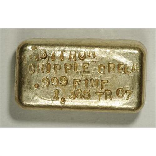 <B>Bitron MS Gold Ingot Uncertified.</B></I> Another small ingot of modern manufacture. This one is stamped on the top side: BITRON/CRIPPLE CREEK/.999 FINE/1.365 TR OZ. Bright yellow-gold color on this piece, as with all five of these.<BR><BR><b>Shipping:</b> Coins & Currency (<a target="_blank" href="http://www.heritageauctions.com/common/shipping.php">view shipping information</a>)