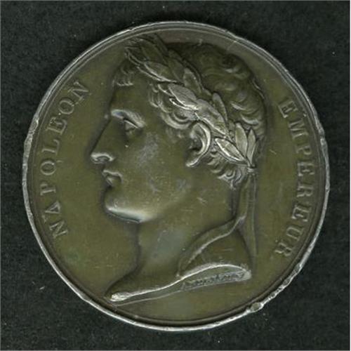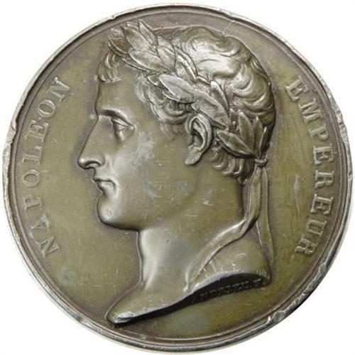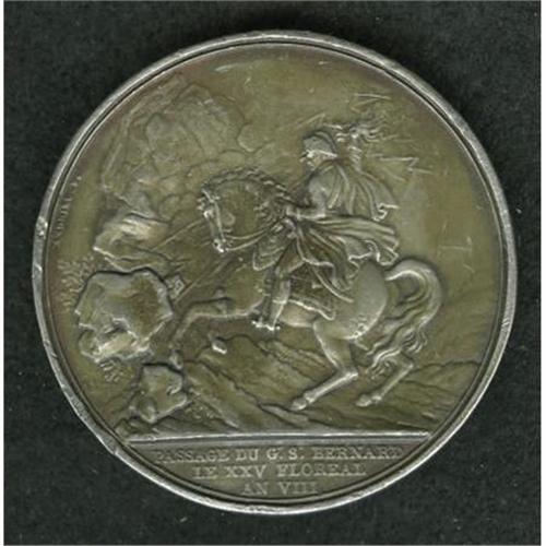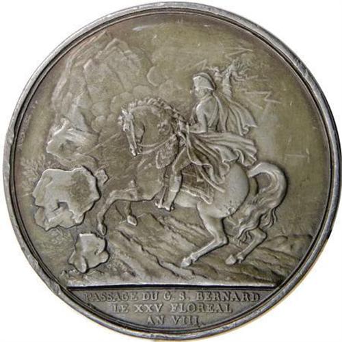 <B>1801 Napoleon at St. Bernard Medal.</B></I> White metal, 57.5 mm, 125.4 gm. Engraved by Andrieu. Obverse: bust left of Napoleon in Roman style. Reverse: Napoleon on horseback hurling thunderbolts. Cleaned, abraded, and toned olive-gray with a subtle lilac spot on the central reverse.<BR><BR><b>Shipping:</b> Coins & Currency (<a target="_blank" href="http://www.heritageauctions.com/common/shipping.php">view shipping information</a>)