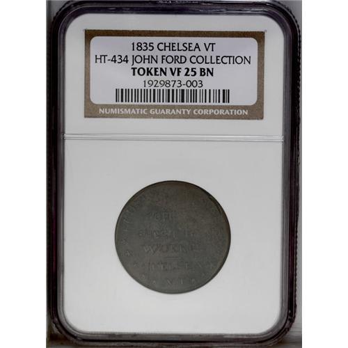 <B>1835 Gustin & Blake, Low-176, HT-434, R.5, VF25 NGC.</B></I> Ex: John J. Ford, Jr. Collection. Another example of this scarce piece with the retouched reverse, here in attractive VF25 condition. The surfaces are predominantly olive-brown, with tinges of tan on each side. The piece is lightly double-struck. The Rulau fourth edition provides a value of $1,200 in VF20.<BR><I>From The Troy Wiseman Collection.</B></I><BR><I>Ex: John J. Ford, Jr. Collection Sale, Part IV (Stack's, 6/04), lot 319.</B></I>