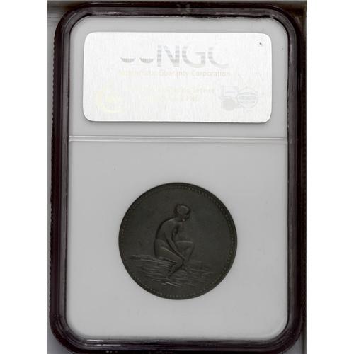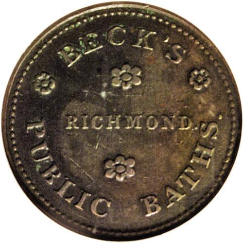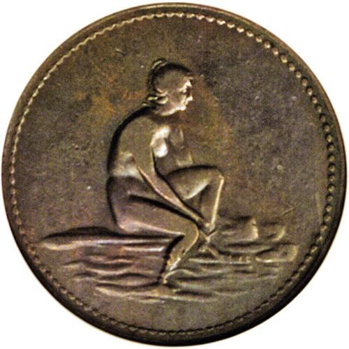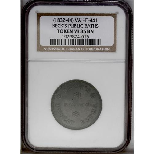 <B>(1832-44) Beck's Public Baths, HT-441, R.3, Richmond, VA, VF35 NGC.</B></I> Copper, 28.5mm. This interesting early Hard Times token was no doubt considered quite risque when it was issued in Richmond about 1832. A nude female tests the bathwaters on one side. This Choice VF piece shows moderate wear, like most examples, and the olive-brown surfaces are problem-free. The Rulau catalog, fourth edition, lists a value of $450 in VF20.<BR><I>From The Troy Wiseman Collection.</B></I>