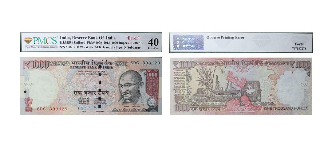 1000 Rupees, 2013, Error, Old Gandhi Series, Obverse Priniting Error, Denomantion in the middle obverse is missed, Inset L, Signed by D. Subbarao, Serial No. 6DG 303129, PMCS Graded 40 Extra Fine, Rare.