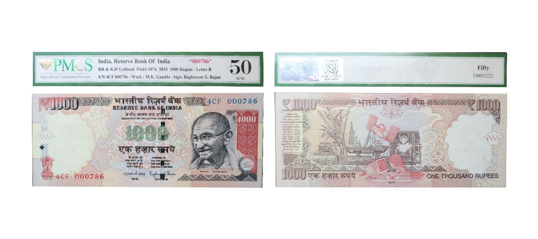 1000 Rupees, 2015, Fancuy Number, Old Gandhi Series, Inset R, Signed by Raghuram G. Rajan, Serial No: 000786, PMCS graded 50 AUNC, Rare.