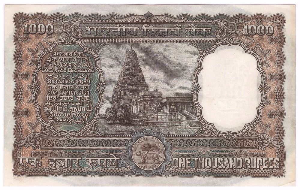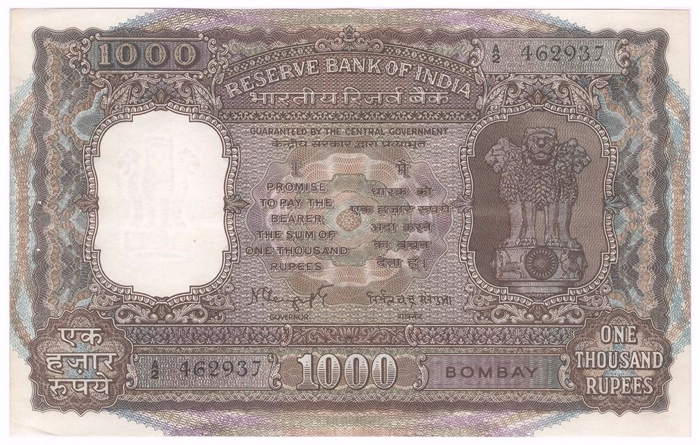 1975, 1000 Rupees, N C Sengupta, Bombay Circle, S.No. A2 462937, (KJ RR # 6.9.4.1), pin holes,choice extremely fine, exceptional quality,Rare in the condition.
