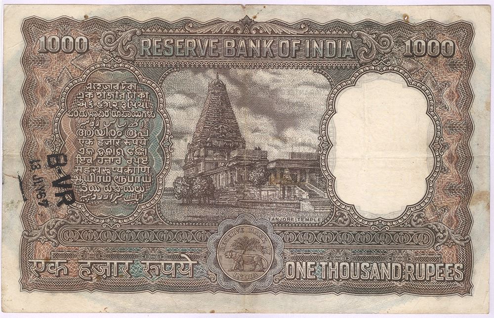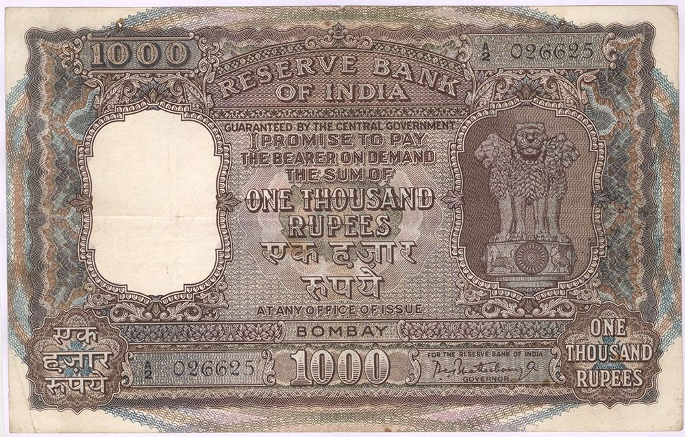1964,1000 Rupees, P. C. Bhattacharya,Bombay,S.No. A2 026625,(KJ RR # 6.9.3.1),some usual fold and holes, choice extremely fine - almost uncirculated,VeryRare.