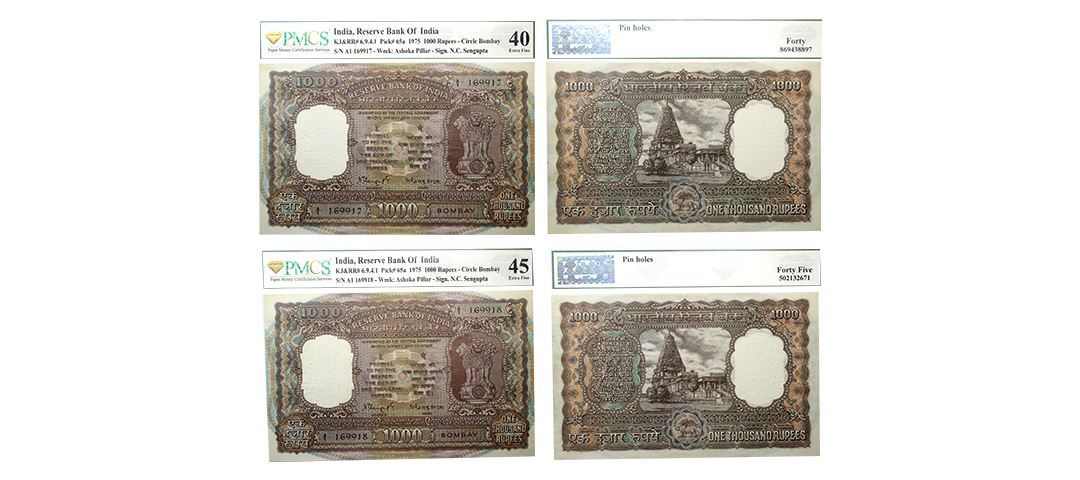 1000 Rupees, signed by N.C. Sengupta, 1975 AD, Bombay Circle, ____ Prefix, Serial No. A1 169917 & Serial No.A1 169918, 1975 AD, a picture of Brihadeeswara temple at Tanjore on the reverse, KJ & RR # 6.9.4.1, Pick # 65a, Graded by PMCS 40 Extra Fine & PMCS 45 Extra Fine, rare.