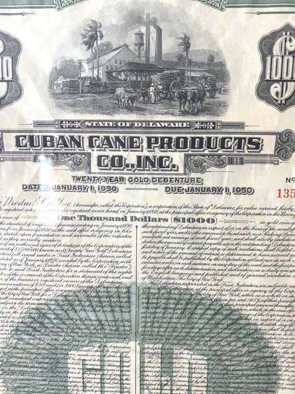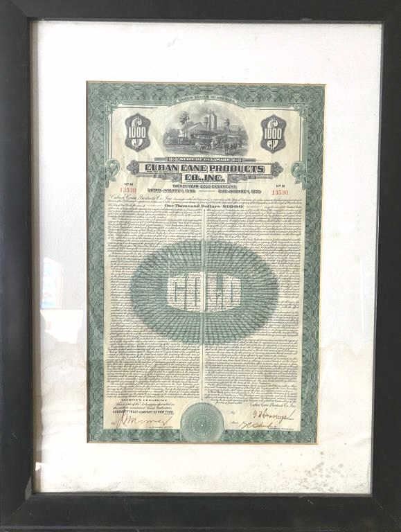 $1000 gold debenture from Cuban cane products signed by Trustee N.Y and officers dated 1930 due 1950, #13530. Framed. The bond measures approximately 14 ¼” x 9 ¼”. Est.: $150-$300