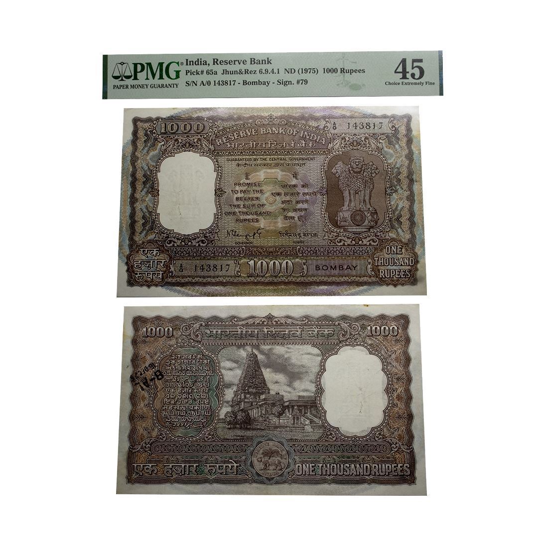 1000 rupees, Tanjore temple series, Bombay circle, ND (1975), signed by N.C. Sengupta, serial no.: A0 143817, correct रूपये in Hindi, J& amp;R 6.9.4.1. Graded 45 Choice Extremely Fine Ink stamps by PMG, Very scarce.