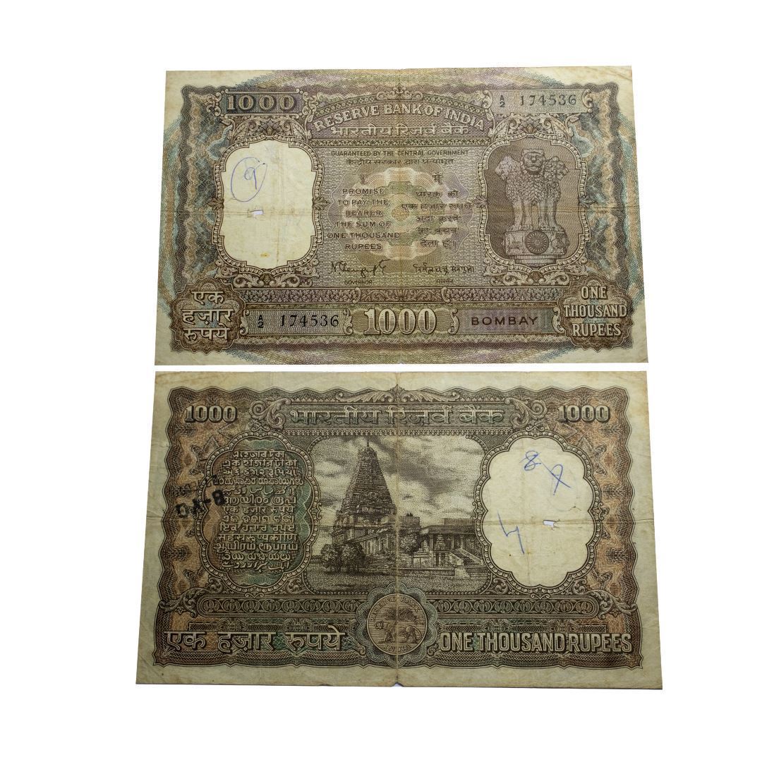 1000 rupees, Tanjore temple series, Bombay circle, ND (1975), signed by N.C. Sengupta, serial no.: A2 174536, correct रूपये in Hindi, J& amp;R 6.9.4.1. Ink annotation on reverse. Fine, Very scarce.