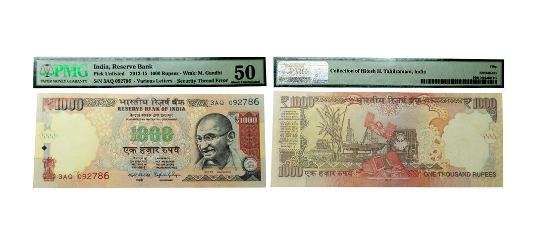 1000 rupees, misprint, Gandhi series, 2015, signed by Raghuram Rajan, inset 'L', Fancy serial no.: 3AQ 092786 without security thread - error, without brille line telescopic design. Ex Hitesh H. Tahilramani Collection, PMG Graded About Uncirculated 50, Very Rare.
