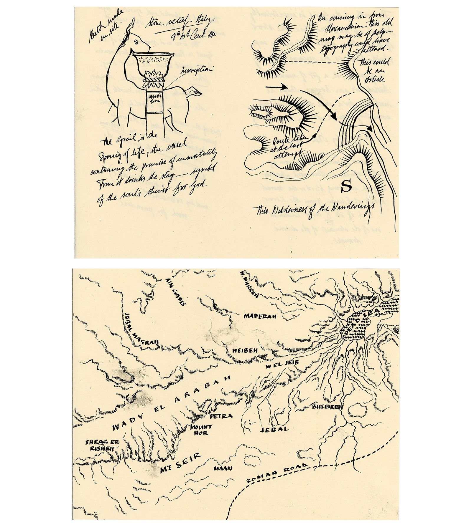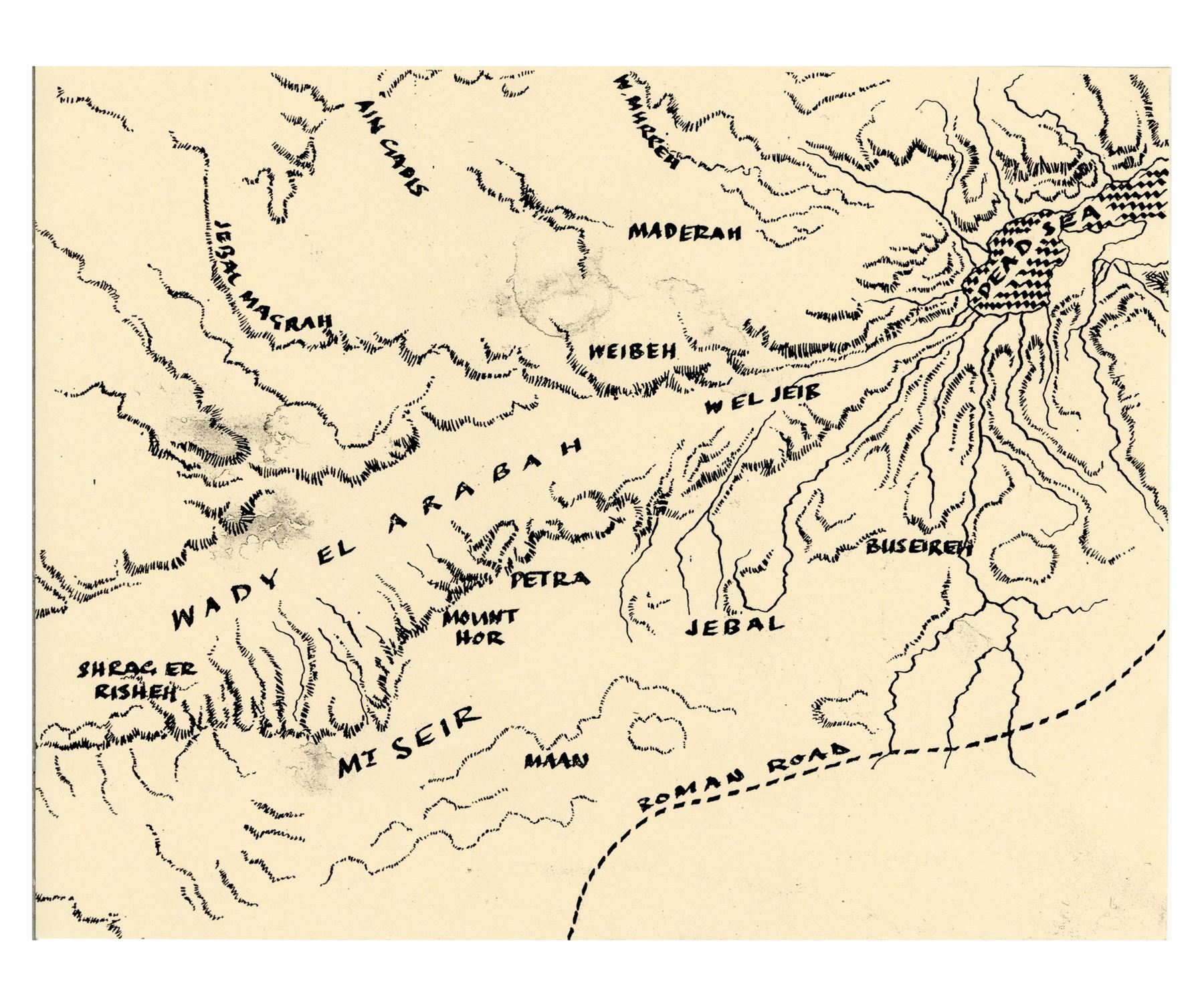 Both of these production-made copies - one depicting a hand-drawn map of the "Wady El Arabah [sic] region with a blank backside, and one depicting a hand-drawn map of a route "coming in from Alexandria" labeled "The Wilderness and the Wanderings" with text on both sides - are printed in black ink on cream-color paper. They exhibit minor creasing from handling. Dimensions (each): 8" x 6" (20.5 cm x 15.25 cm)