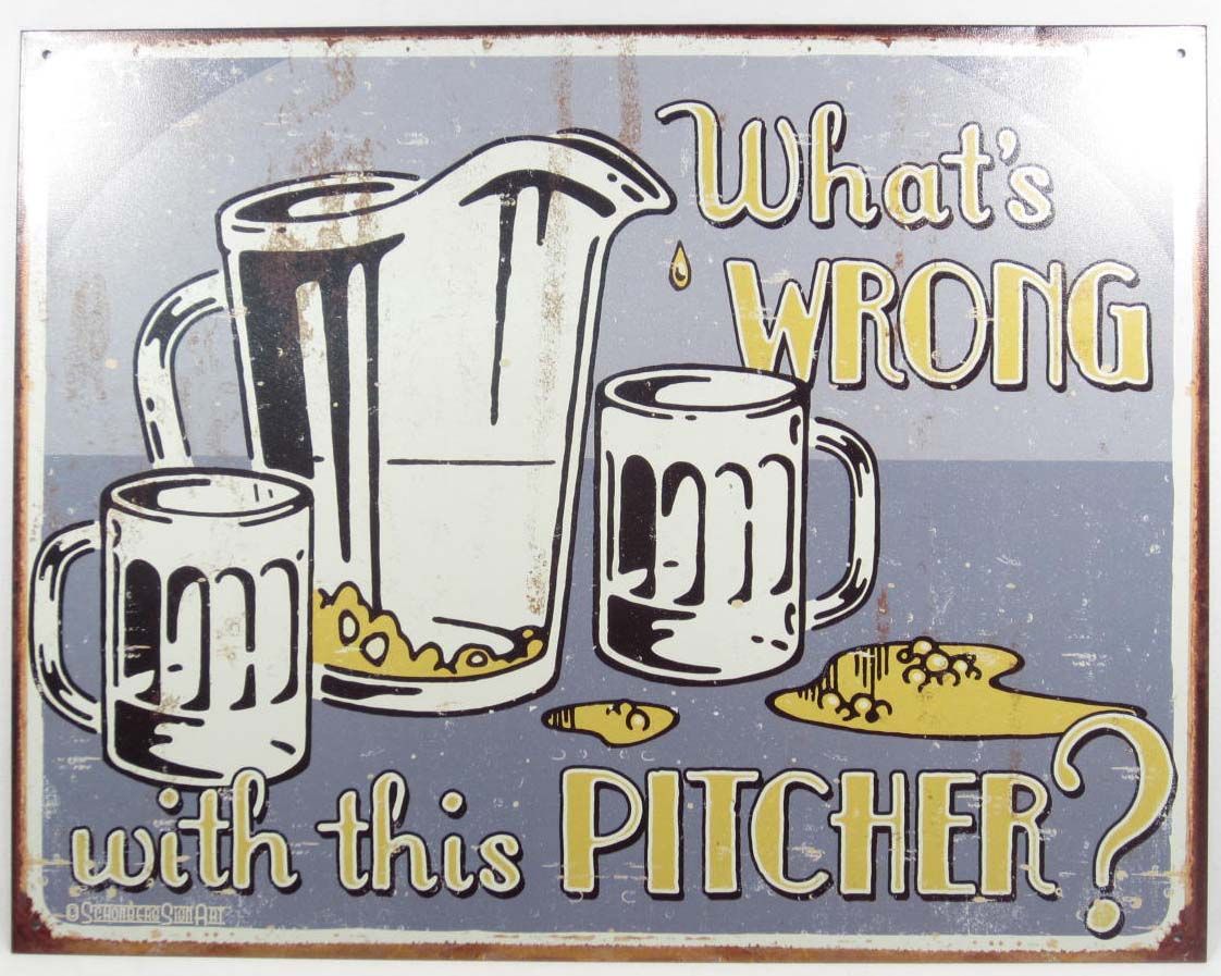 10036 - WHATS WRONG WITH THIS PITCHER METAL SIGN