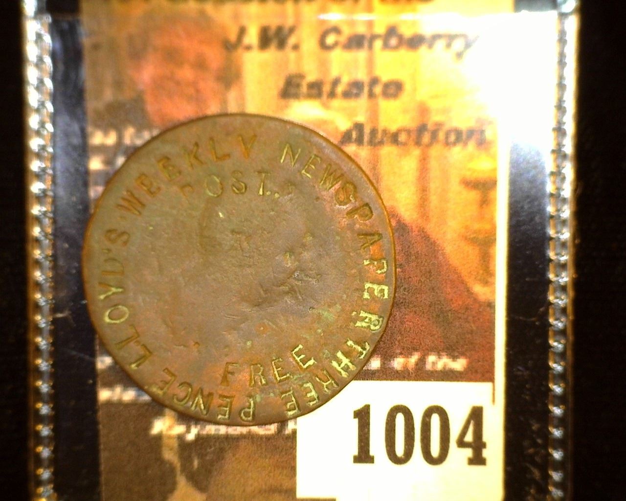 1004. Great Britain Half Penny Counter marked "Free/Three Pence Lloyd's Weekly Newspaper", rev. "Purchase Number One of Lloyd's Last/Publication".