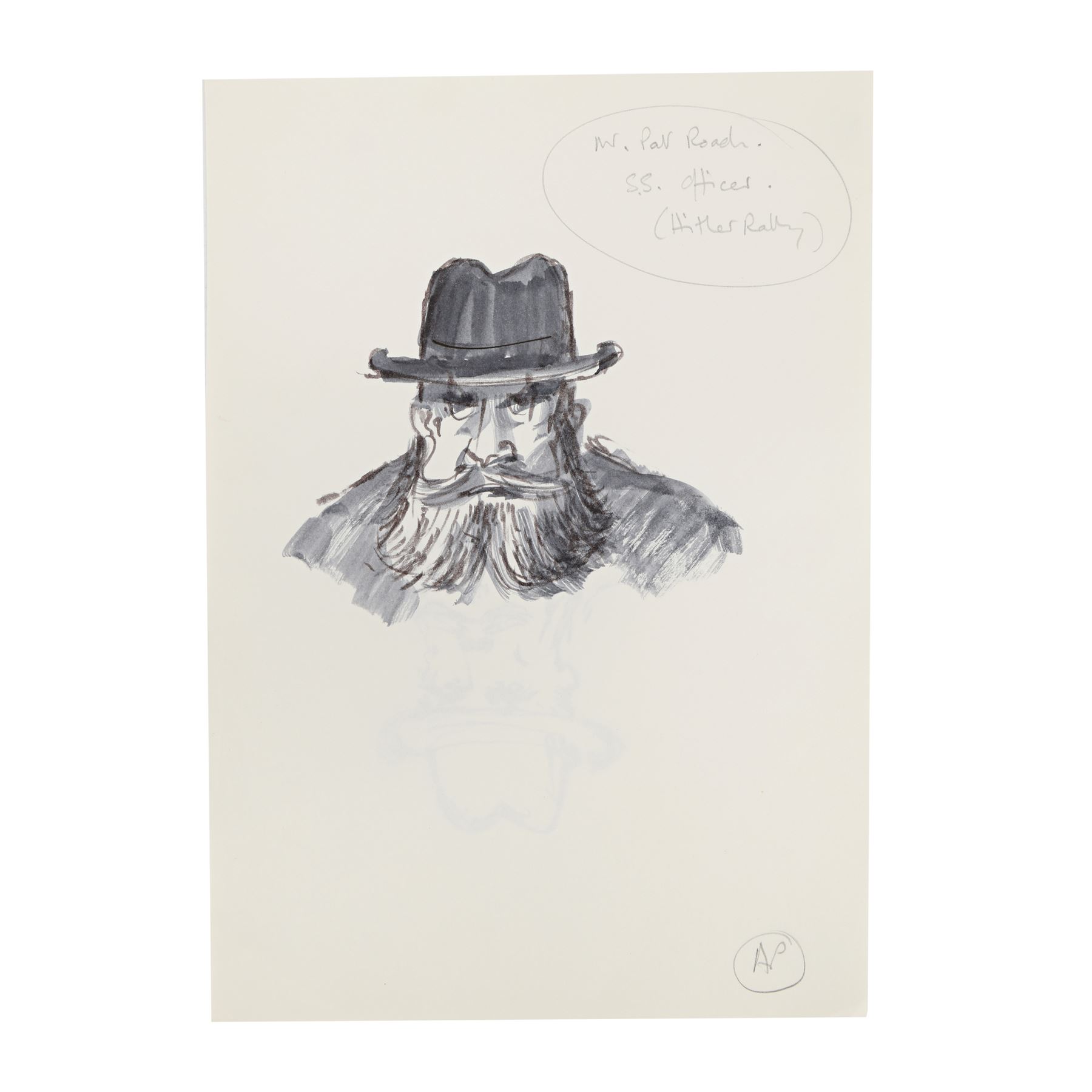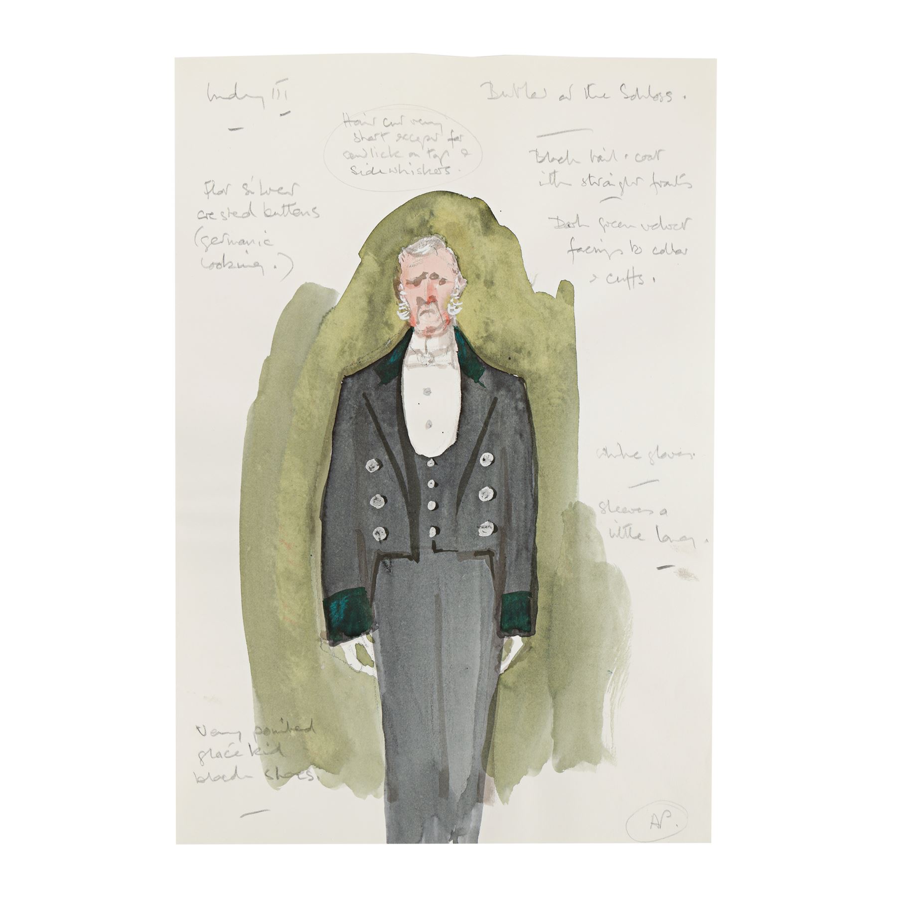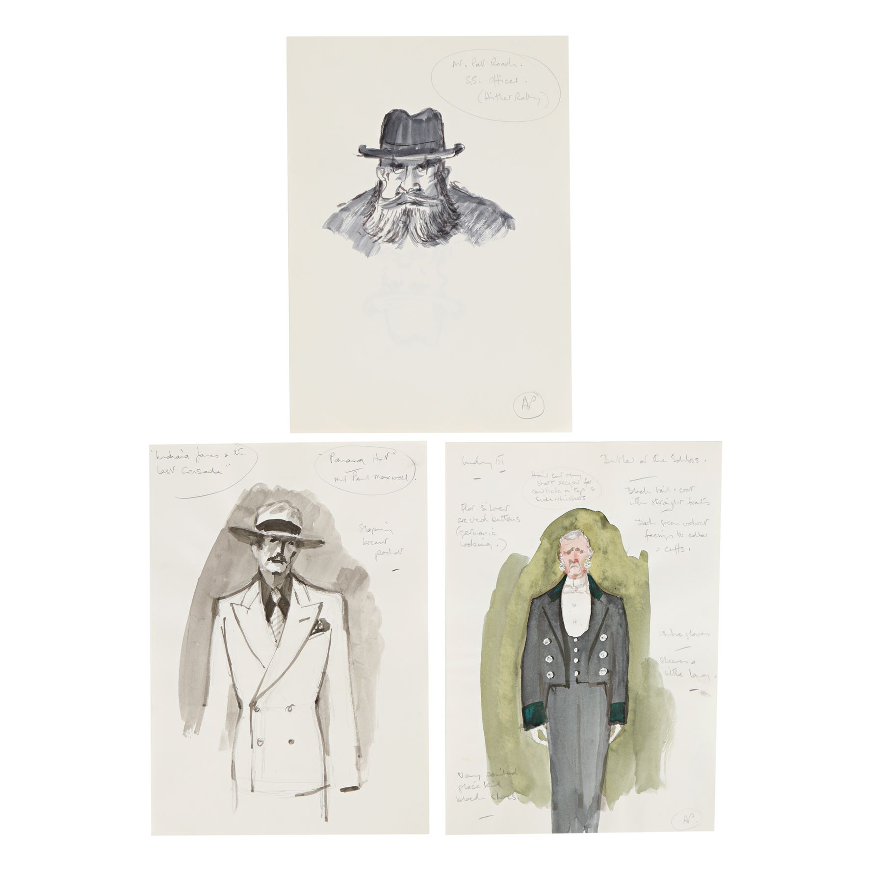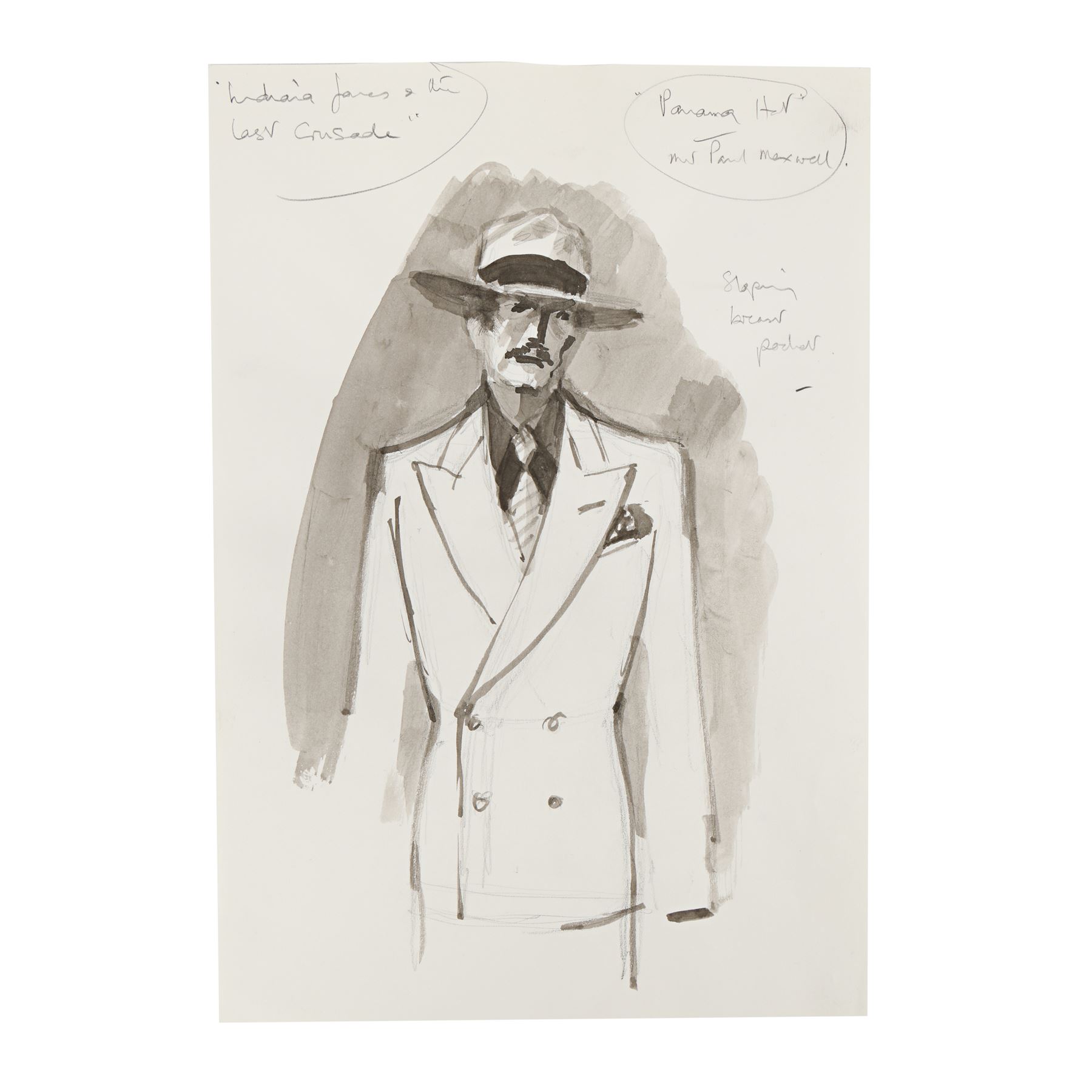 INDIANA JONES AND THE LAST CRUSADE (1989) - Set of Three Anthony Powell Hand-Drawn and Colored Costume Design Artwork - Costume design artwork by three-time Academy Award-winning costume designer Anthony Powell from the production of Steven Spielberg's adventure sequel Indiana Jones and the Last Crusade. This lot features three pages of hand-drawn, colored designs by Powell for the characters of "Panama Hat" (Paul Maxwell), "S.S. Officer" (Pat Roach) and "Butler at the Schloss." Each page also features handwritten notes and annotations from Powell, and is signed "AP." Dimensions: (each page) 11.75" x 8.25" (30 cm x 21 cm)