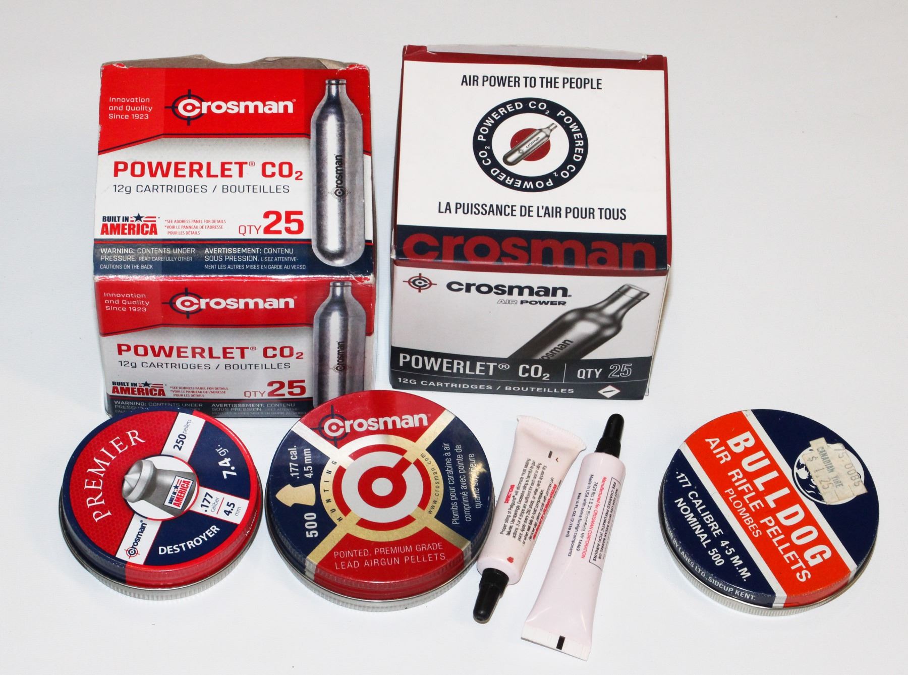 LOT OF 2 POWERLET CO2 12G CARTRIDGES, THREE TINS OF PELLETS AND 2 PELLGUN OIL FORMULA TUBES