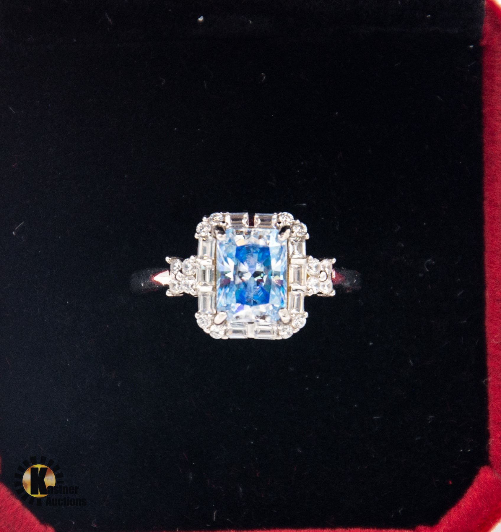 CERTIFIED 6 X 8 RECTANGULAR SHAPED CUT MOISSANITE STONE VVS LIGHT BLUE COLOR WITH 10 EMERALD CUT CZ’S WITH 16 ROUND BRILLIANT CUT CUBIC ZIRCONIA SET IN RECTANGULAR HALO & ALSO IN SHANKS SET IN 925 SILVER RING SIZE ADJUSTABLE COMES WITH GIFT BOX