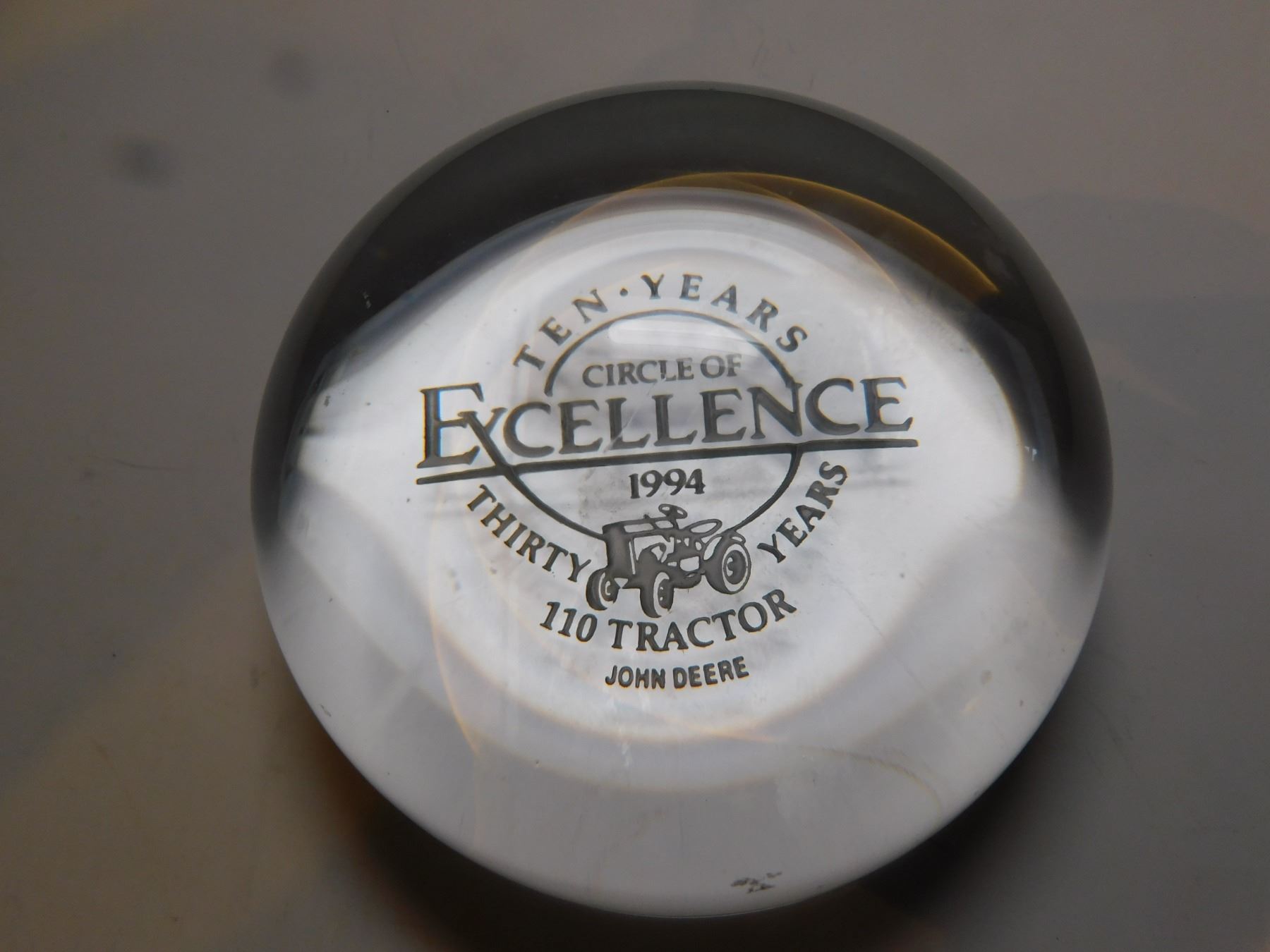 1007. JOHN DEERE 110 TRACTOR CIRCLE OF EXCELLENCE GLASS PAPERWEIGHT, SCARCE