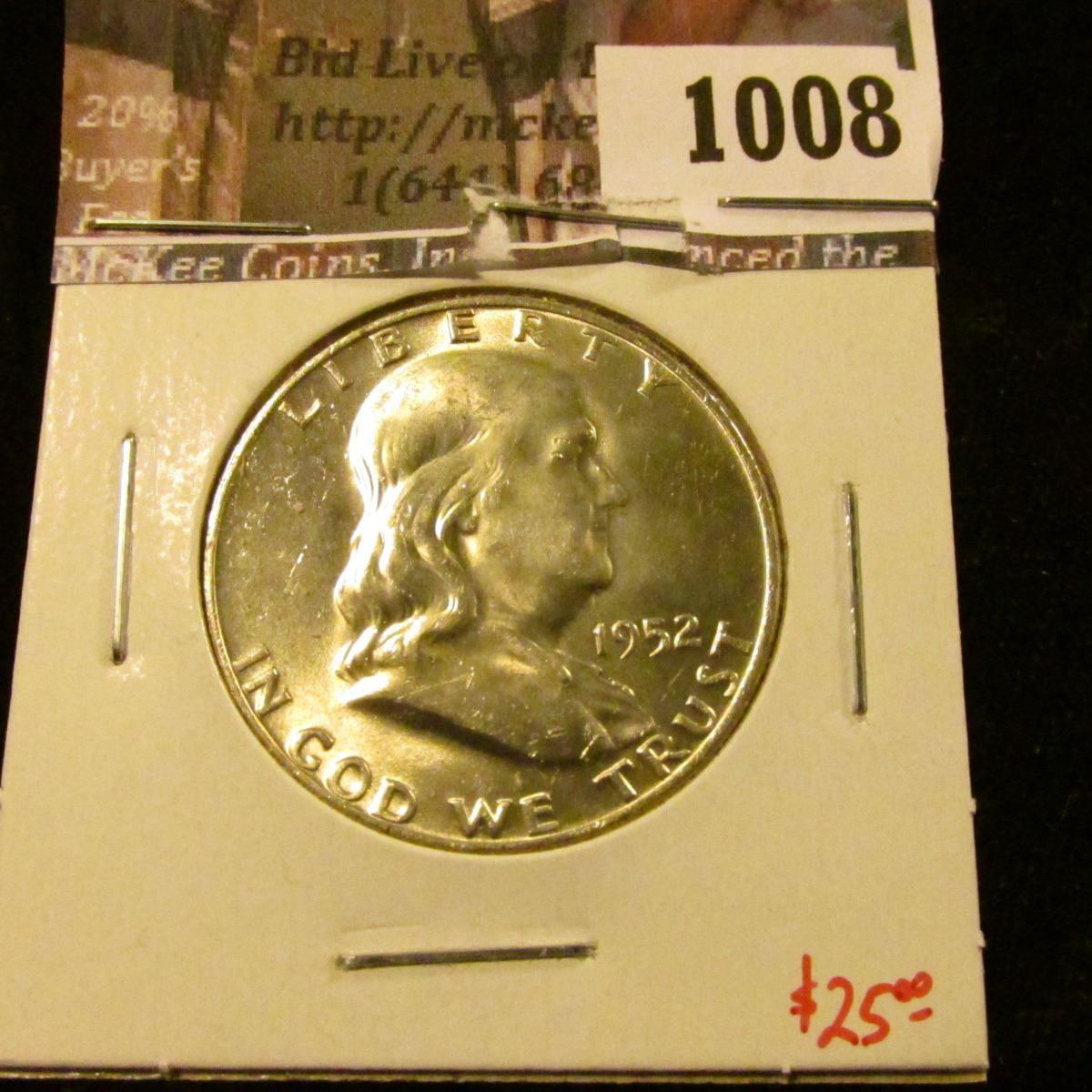 1008 . 1952-D Franklin Half Dollar, BU, value $25