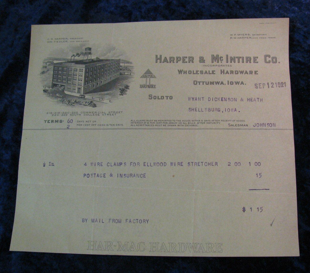 101. 1921 Harper & Mc Intire Co., Ottumwa, Ia. Invoice with attractive letterhead lithograph.