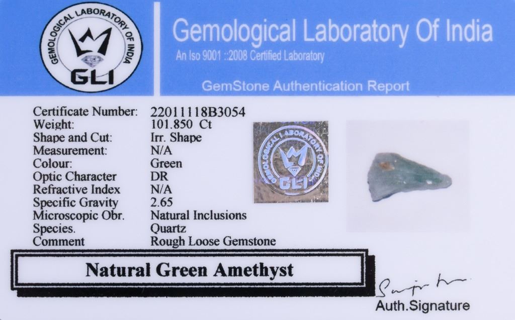 101.85 ct irregular shape rough green natural amethyst. Accompanied with GLI certificate.