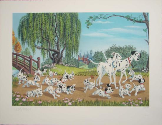 Featured here is a signed and numbered Giclée Print as reproduced from a 1961 cover illustration created by artist Norm McGary for Western Publishing's Big Golden Book Disney's 101 Dalmatians. In this image Pong and Perdita stroll through the park with their adorable pups!