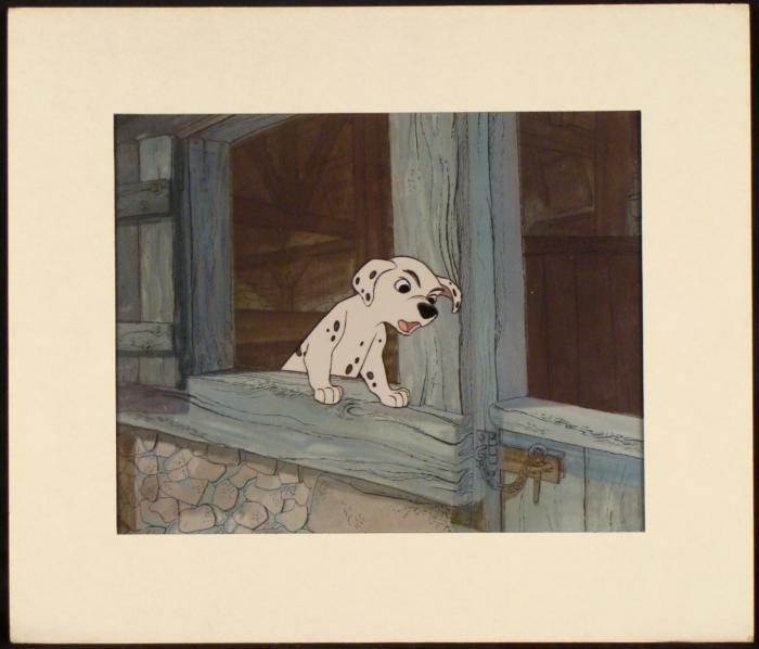 This cel features a young dalmation pup peering through a barn window, and either barking or talking. The background is a copy printed on paper.