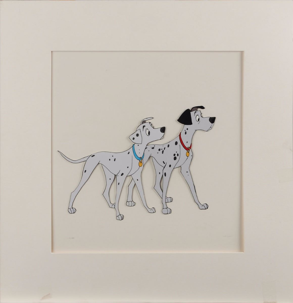 Unique grouping of items related to the Disney classic 101 Dalmatians, highlighted by a green loose-leaf binder from the estate of animation legend Ken Anderson. The binder is annotated in black felt tip, "Searle's Sketches of London," signed on the inside front cover by Anderson, and contains sixty-two glossy photos, 8 x 10 and 10 x 8, each featuring drawings of London settings and citizens by artist Ronald Searle, stamped on the reverse, "Source: Ronald Searle's—Looking at London, 101 Dalmatians" and "Important! Please return to Walt Disney Studio Library." Also included is a hardcover first edition of The Hundred and One Dalmatians, with original dust jacket; and an original production cel of Pongo and Perdita from 101 Dalmatians, depicting the two dogs in a state of alertness, with image measuring 9.25 x 6.75, with a mat opening of 11.25 x 11.5. In overall fine condition. One of Disney's 'nine old men,' Anderson worked at Disney for forty-four years and made key contributions to Snow White and the Seven Dwarfs, Pinocchio, and The Jungle Book. Anderson was responsible for the art direction and production design for film adaptation of 101 Dalmatians, which was released in 1961.