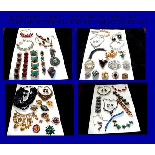 The Group 1 pictures consist of 9 pieces. There are 4 bracelets, 3 Necklaces (the Red and Pink Necklace is a Rare Festoon necklace. There is 1 Full Parure and there is 1 fur clip. All the pieces are Designer Unknown high quality pieces.