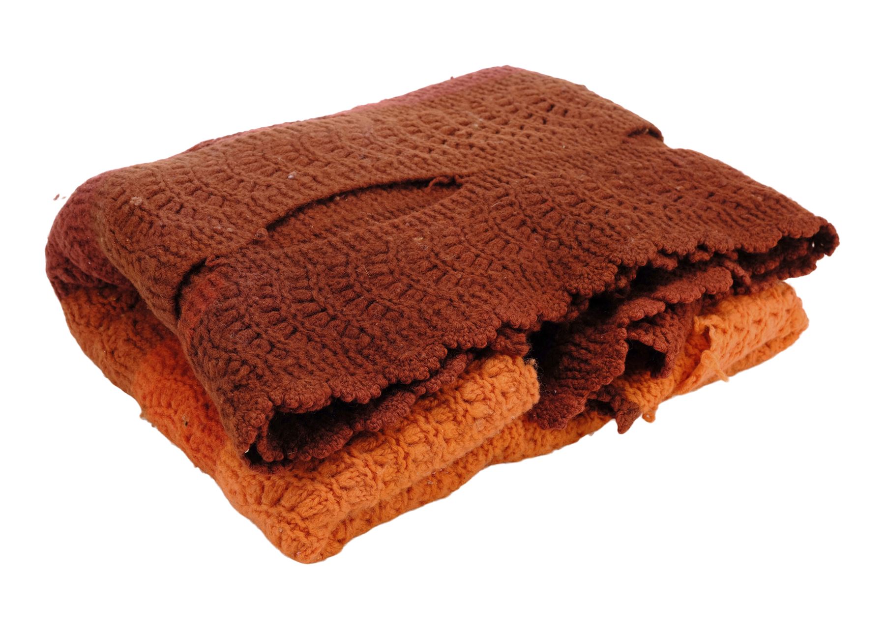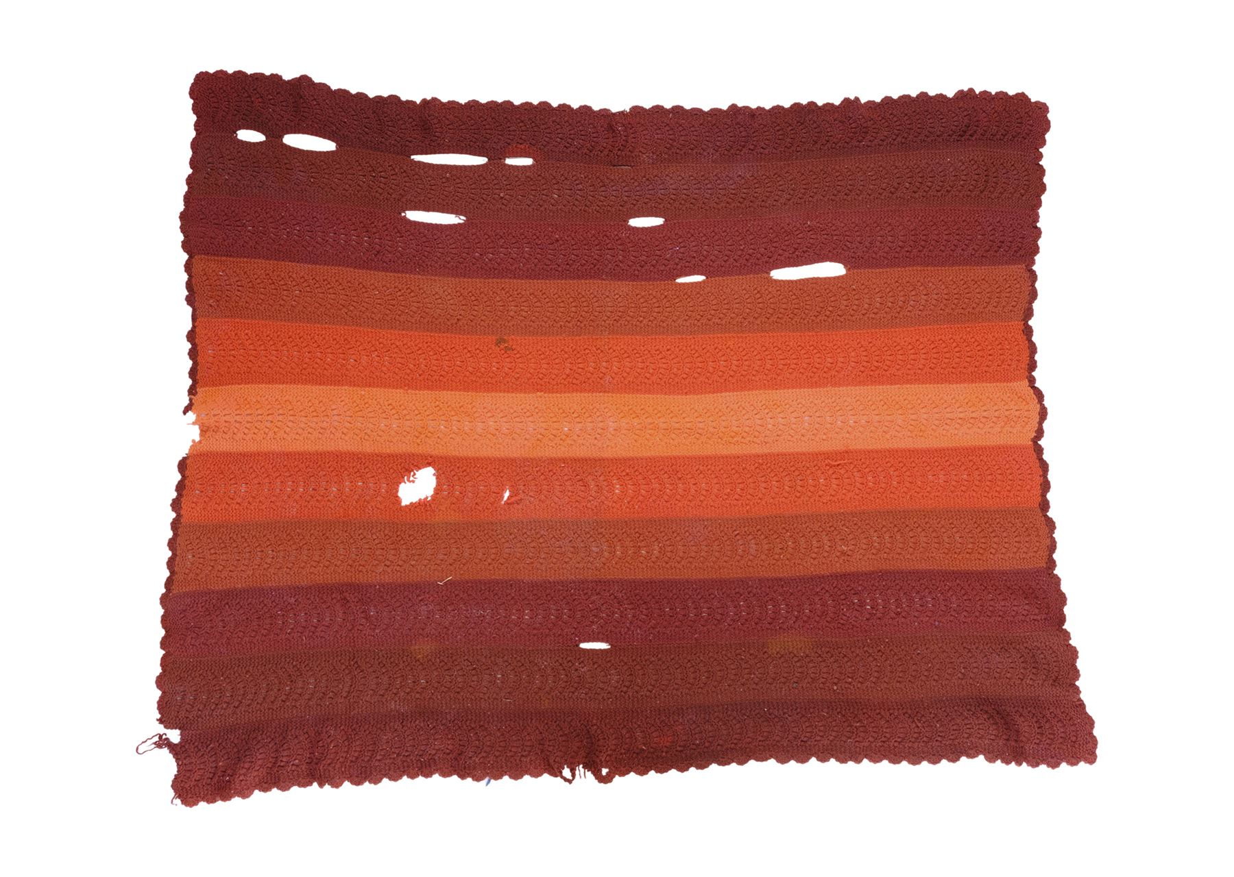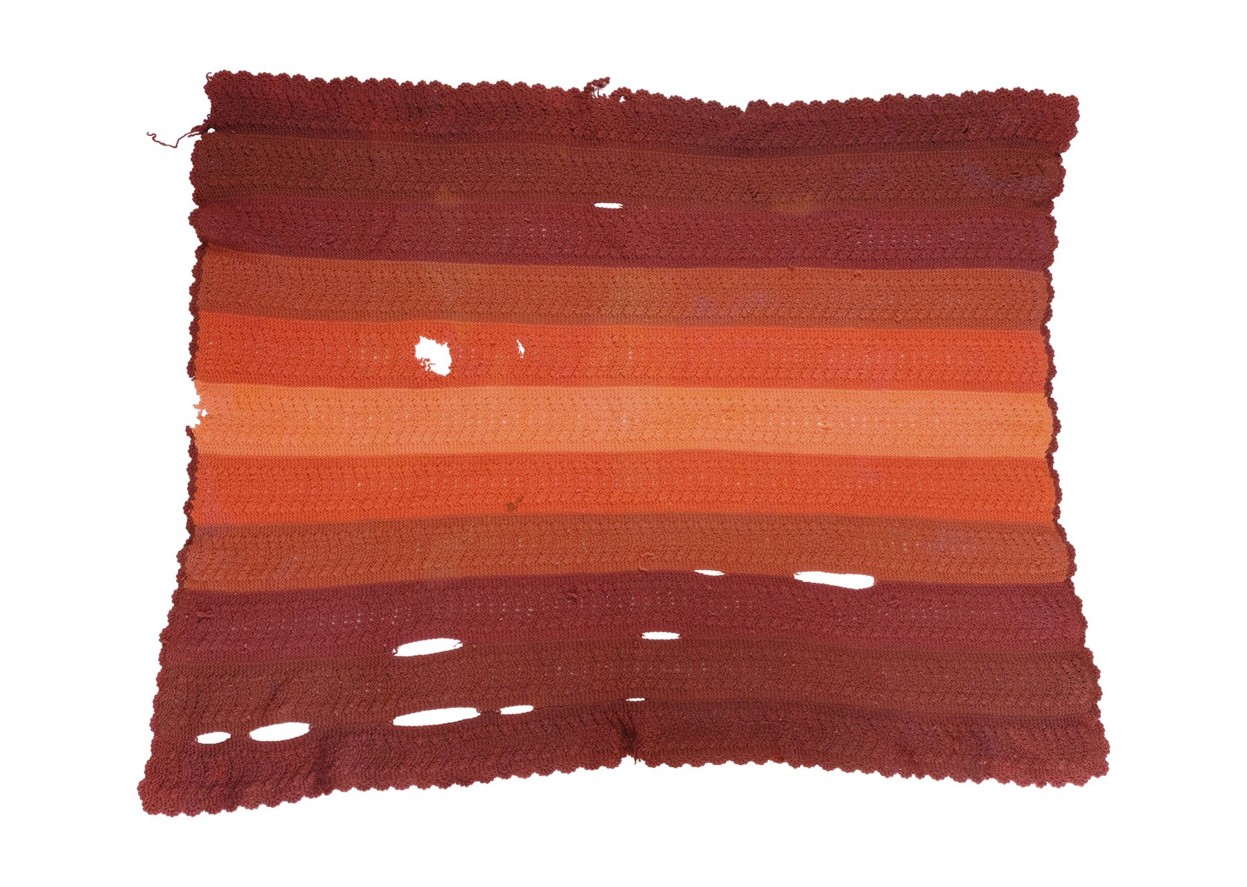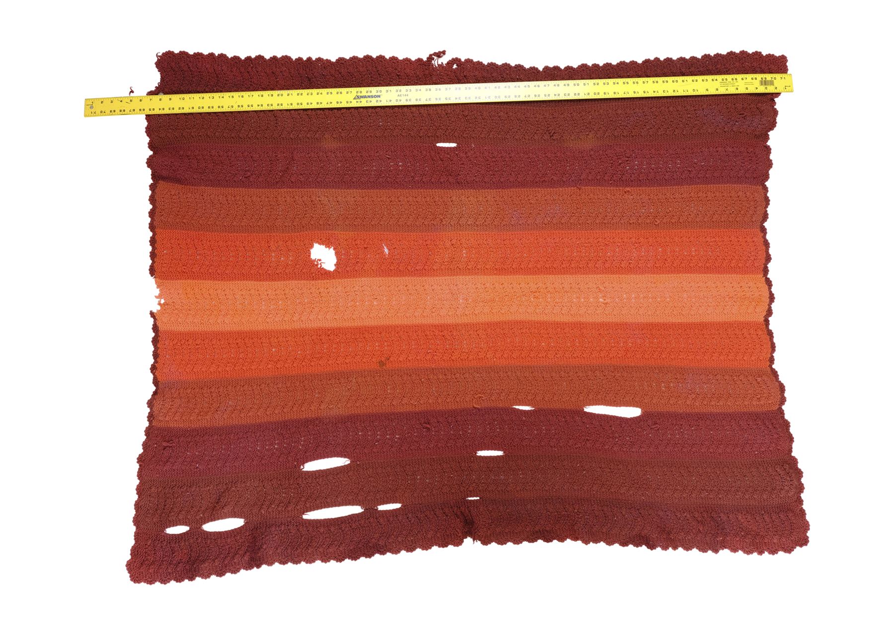 This blanket is made of crocheted orange to brown gradient wool stripes with a brown scallop trim. The blanket exhibits pilling material. Dimensions: (folded) 15" x 15" x 5" (38.25 cm x 38.25 cm x 12.75 cm)