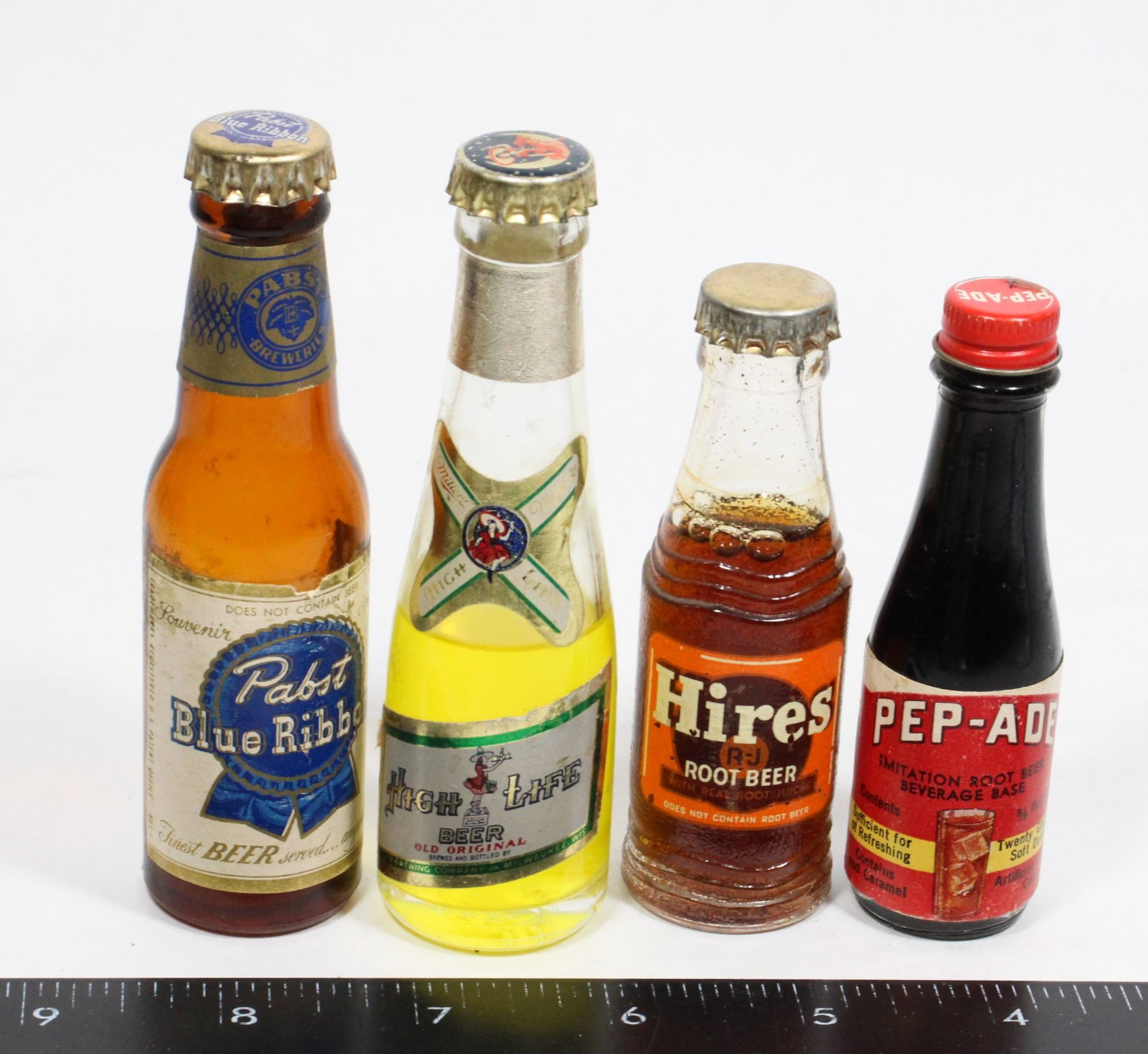PABST BLUE RIBBON AND HIGH LIFE, DOES NOT CONTAIN ALCOHOL OR DRINKS FOR DISPLAY ONLY VINTAGE MID 20TH CENTURY MINIATURE BOTTLES