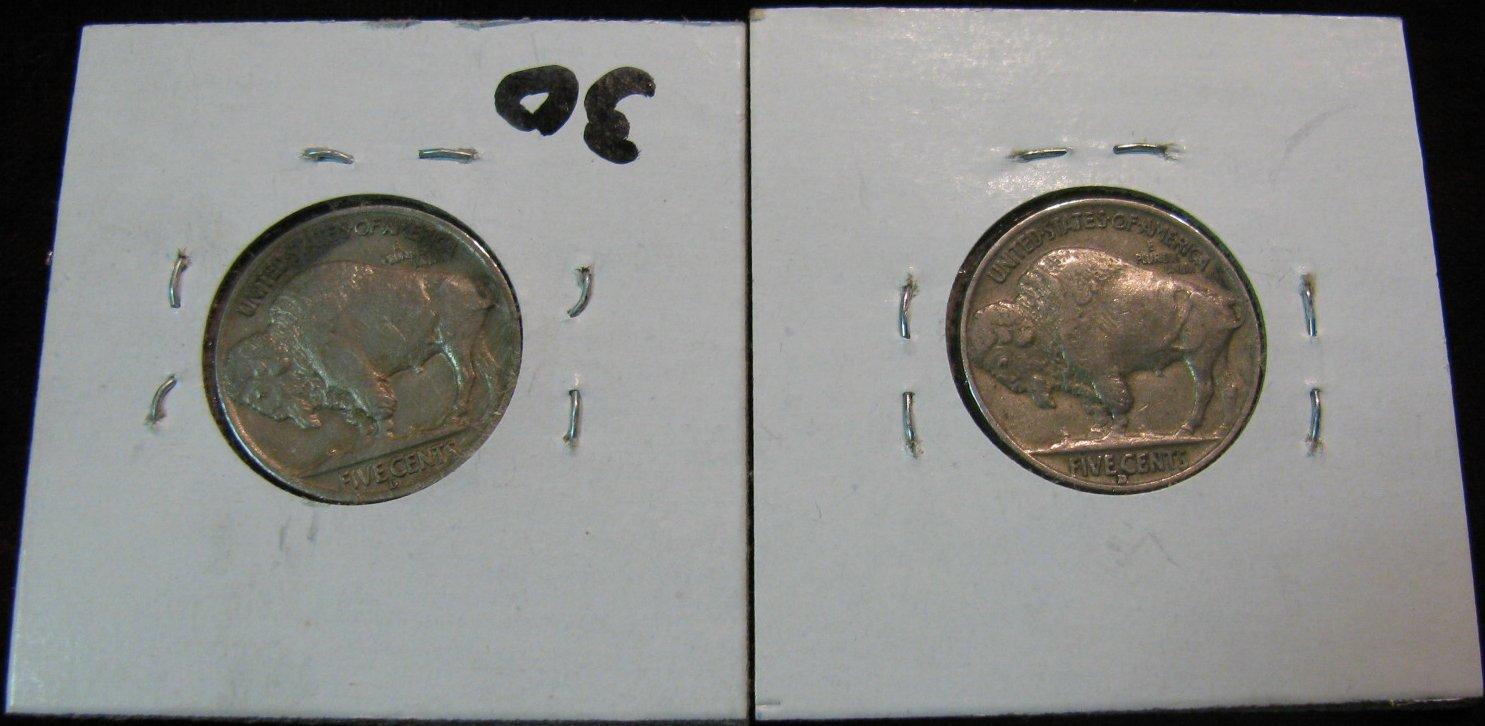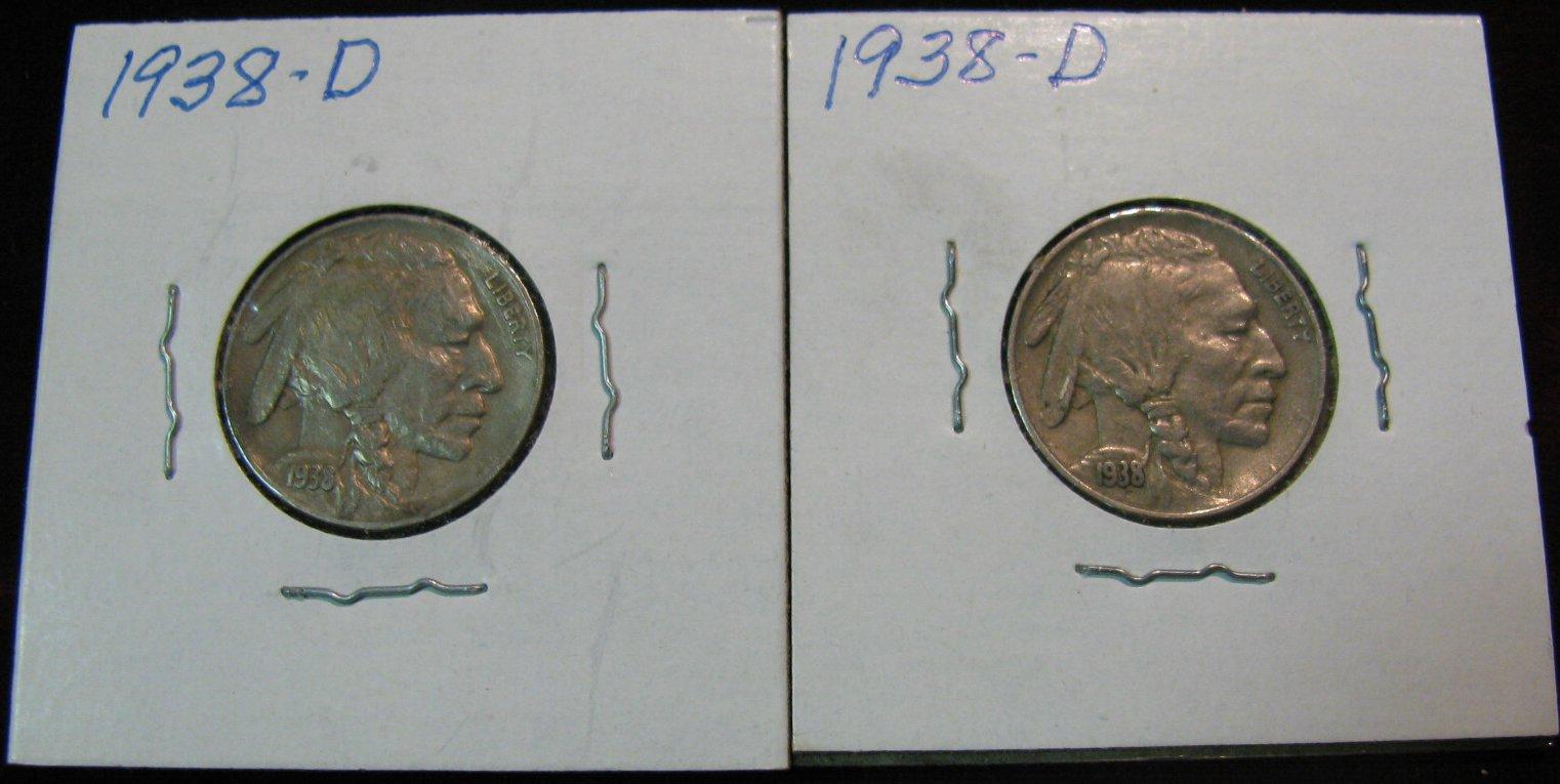 1012. (2) 1938D Buffalo Nickels. EF.