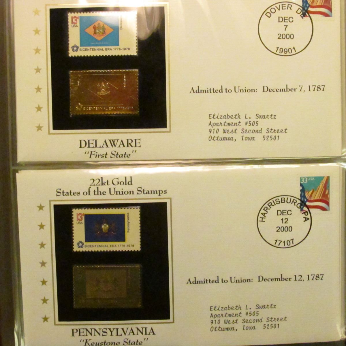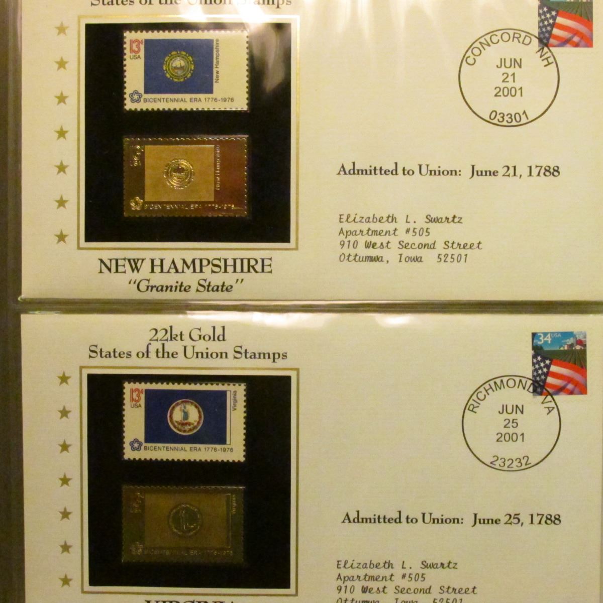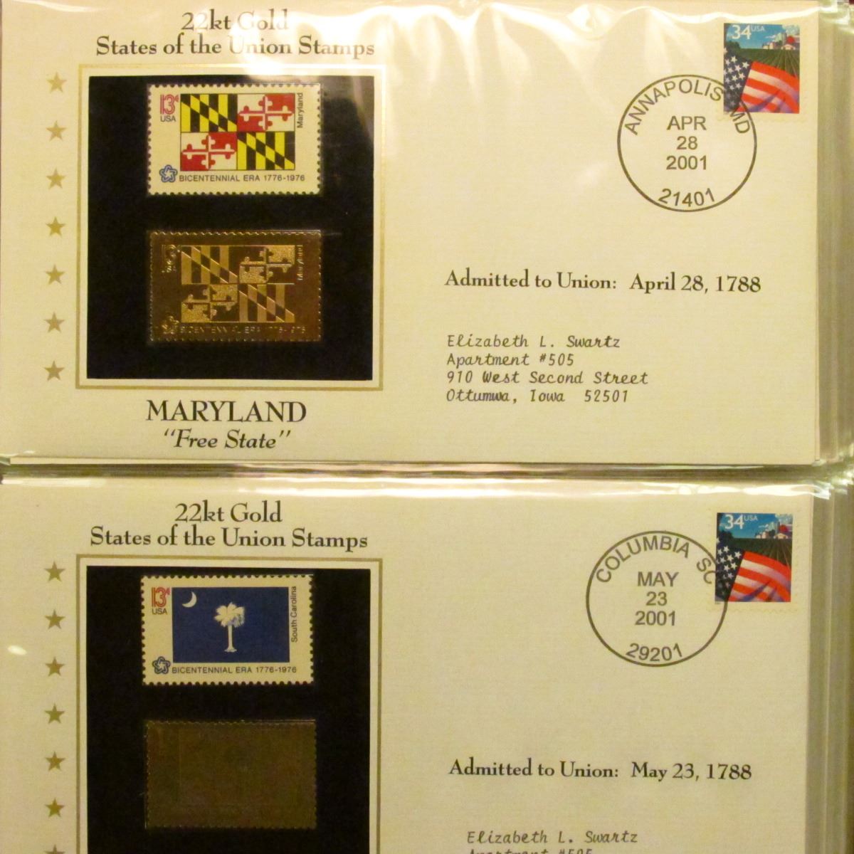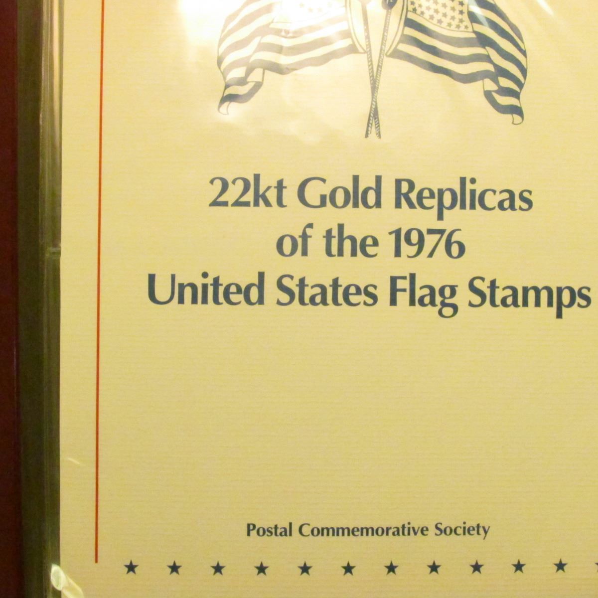 50 Piece Set of 22kt Gold Replicas of the United States Flag Stamps in a speical album. Each of the covers is post marked with original stamp and includes an unused .13c Flag Stamp and the 22Kt Gold Replica stamp. I believe each cover retailed at $19.95 each for a total cost of $997.50.