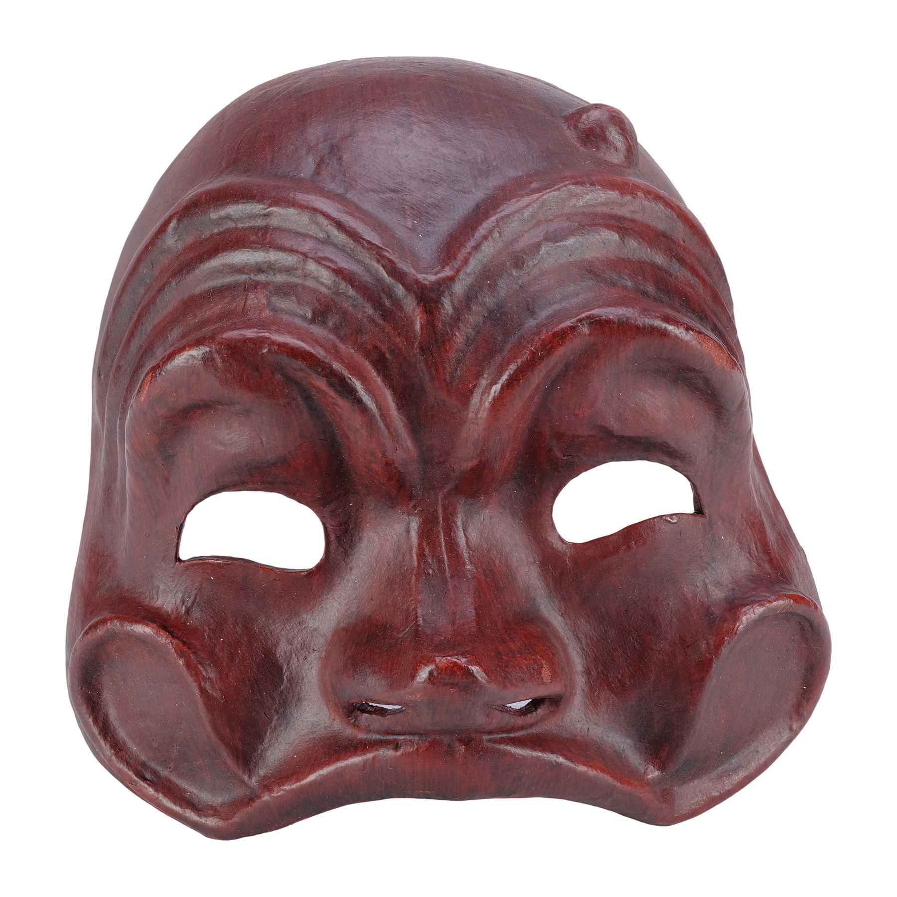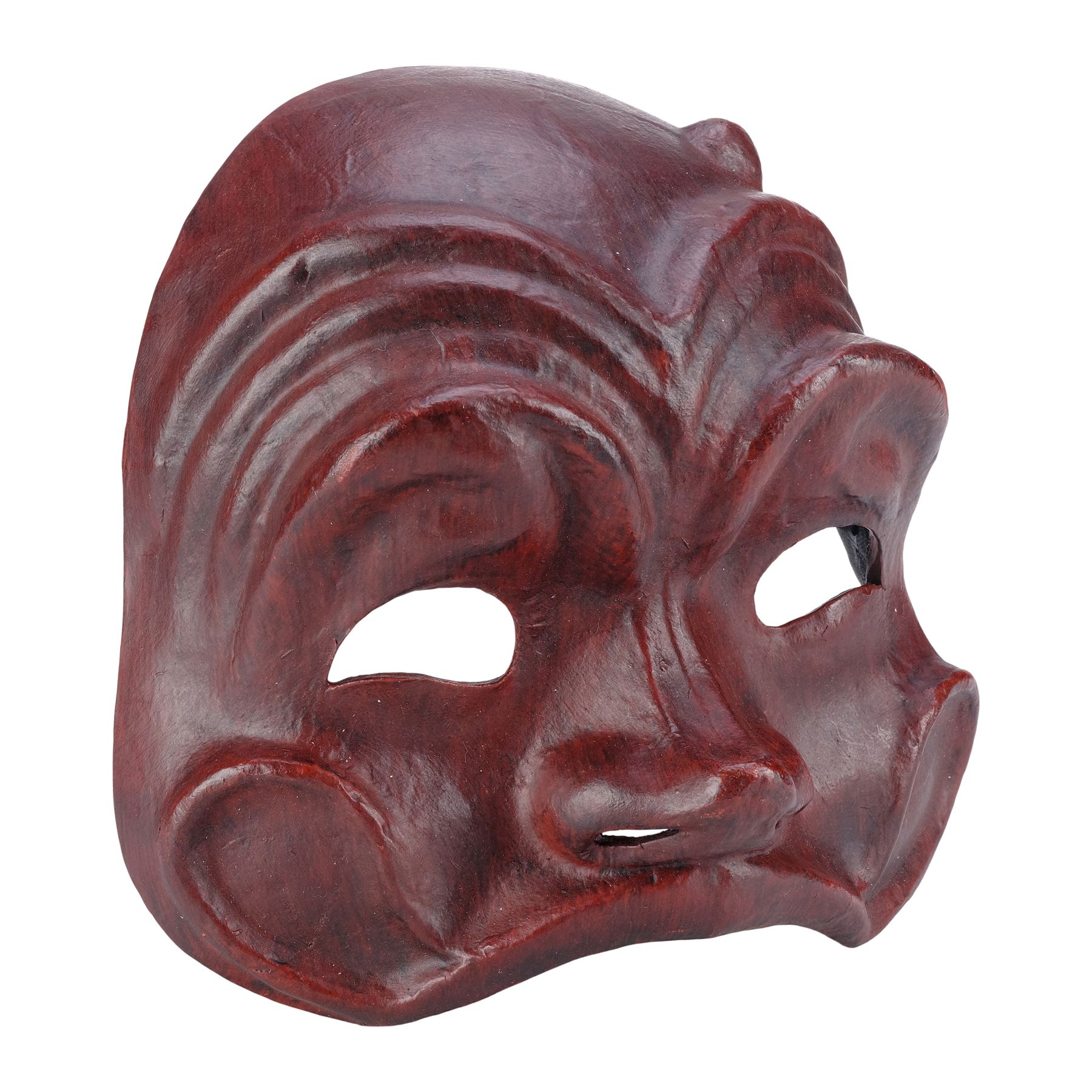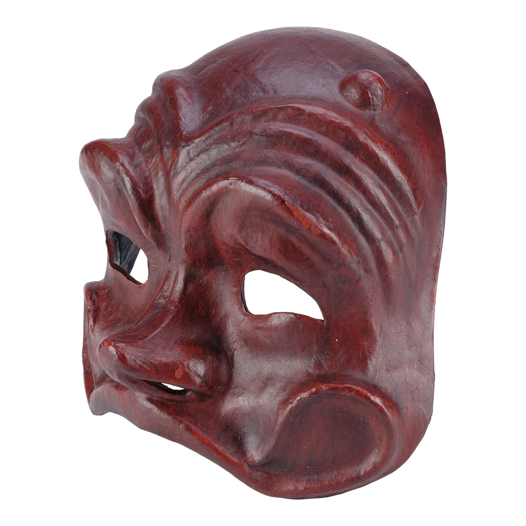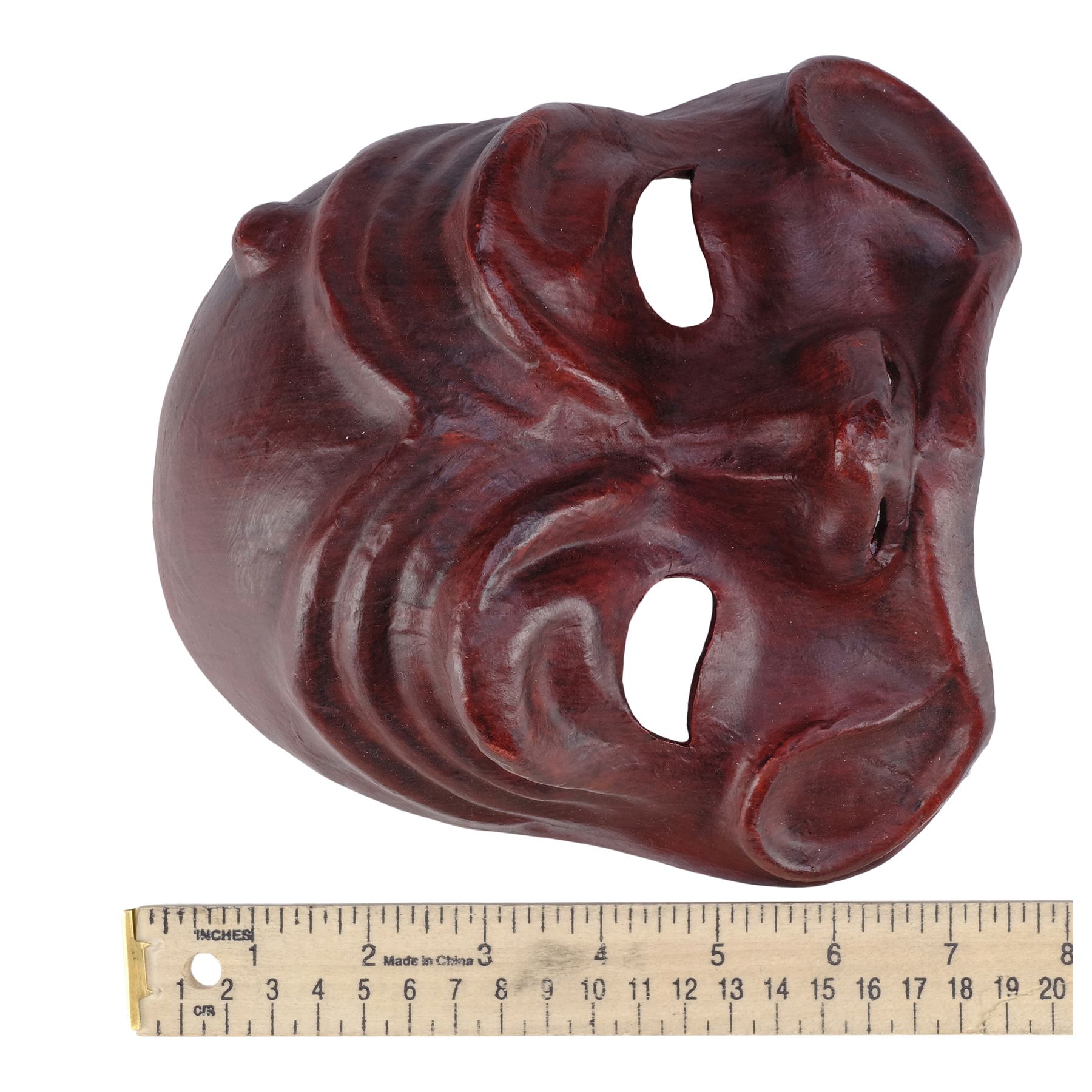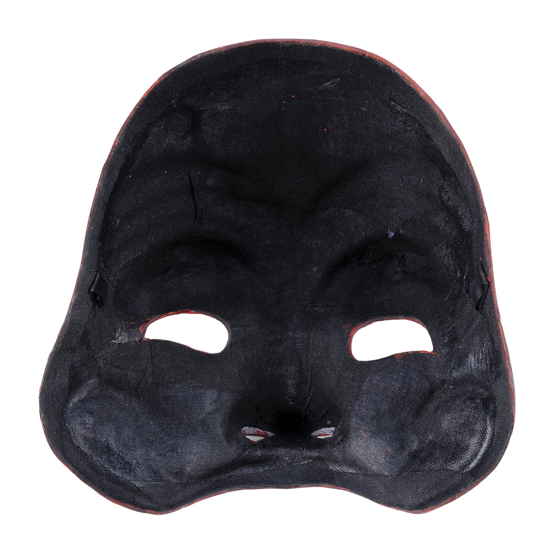 This mask is made of a black mesh sculpted casting painted red that covers the top half of a face and features black satin ribbon loops on the interior sides that allow a string to be threaded through to wear the mask. This lot exhibits minor grime and scuffed paint on the nose and eyebrows.