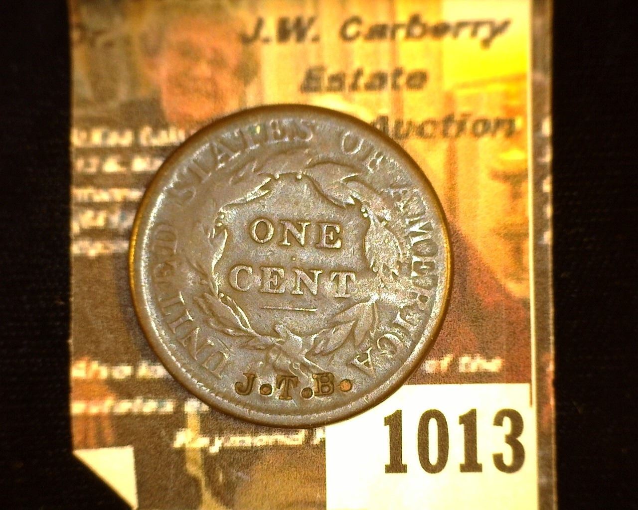 1013. 1812 U.S. Large Cent c/s "J.T. Bradford/Muncie Ind.", rev. c/s "J.T.B.".