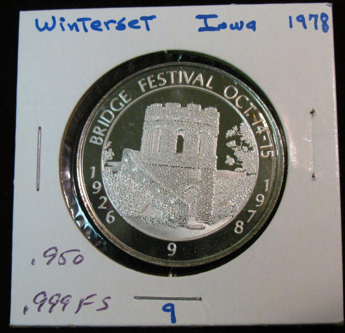 1013. 1978 Winterset, Ia. Proof .999 Fine Silver Medal. Weighs .950 ozs. Rare serial no. 186.