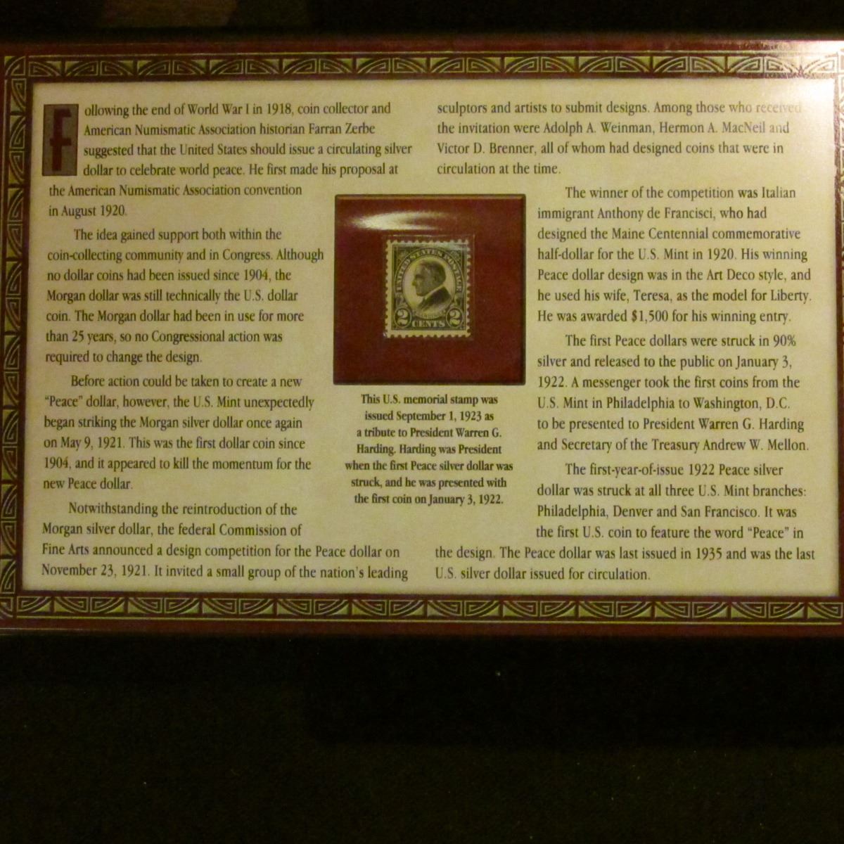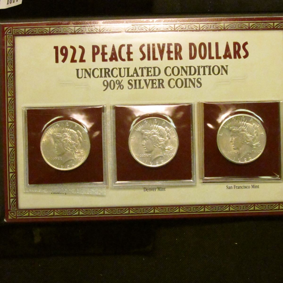 "The Complete Collection of Uncirculated First-Year-of-Issue Peace Silver Dollars", issued by "PCS Stamps & Coins". Includes P, D, & S 1922 Silver Dollars. All stored in a vinyl holder.