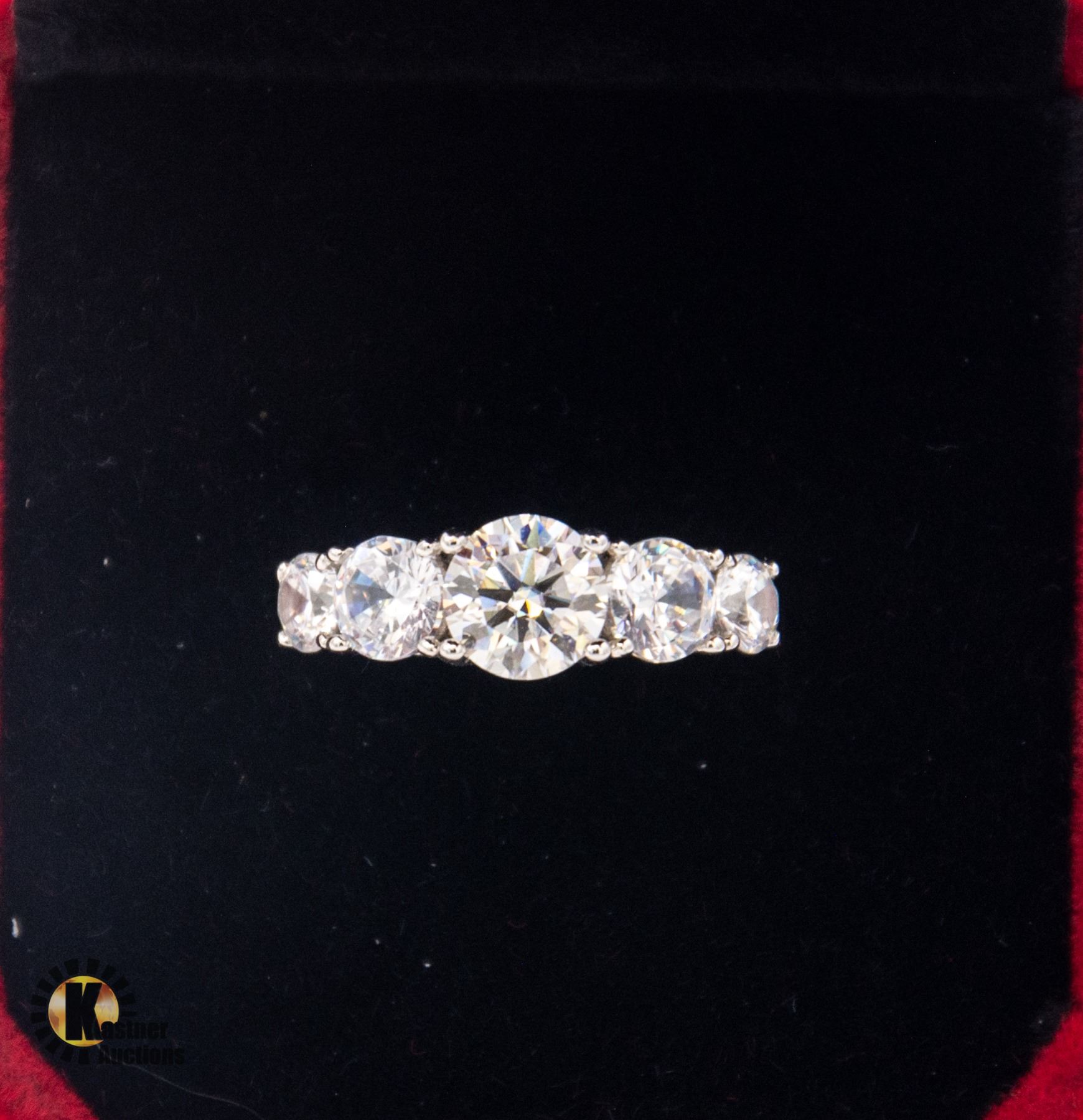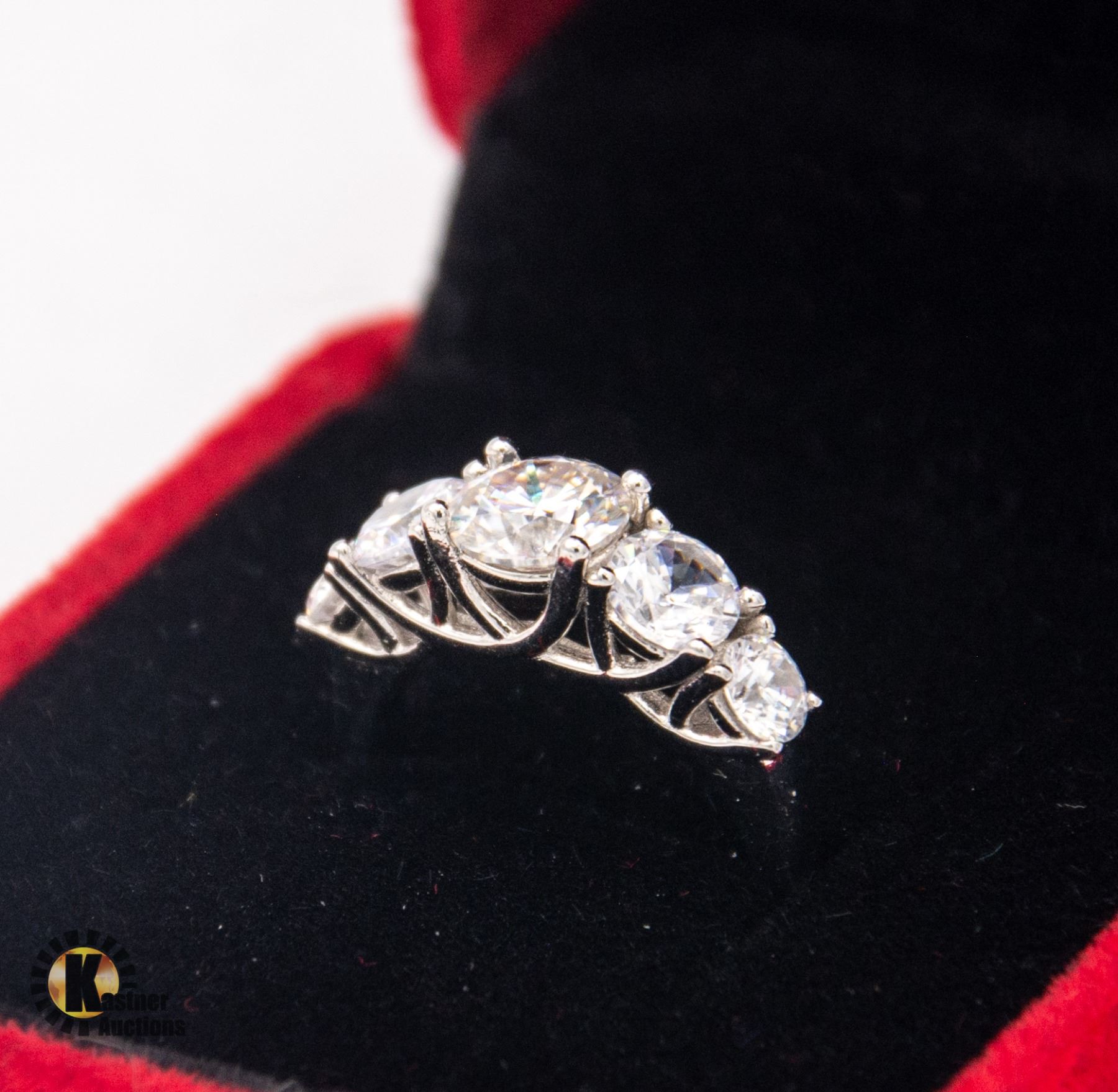 MOISSANITE STONE VVS D COLOR SET IN CENTER WITH 2 GRADUATING IN SIZE CUBIC ZIRCONIA ON EACH SIDE OF CENTER SET IN 925 SILVER RING SIZE 5 COMES WITH GIFT BOX