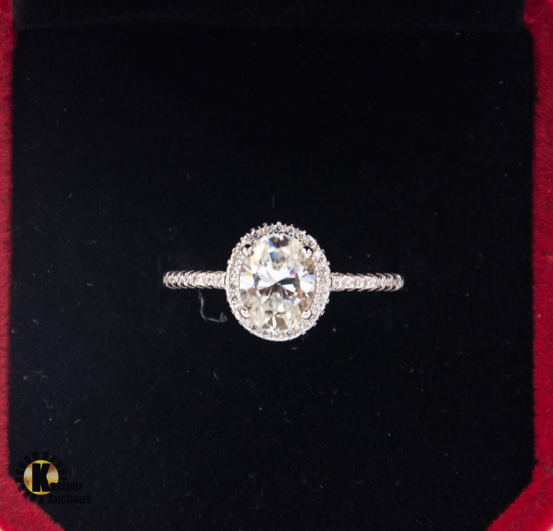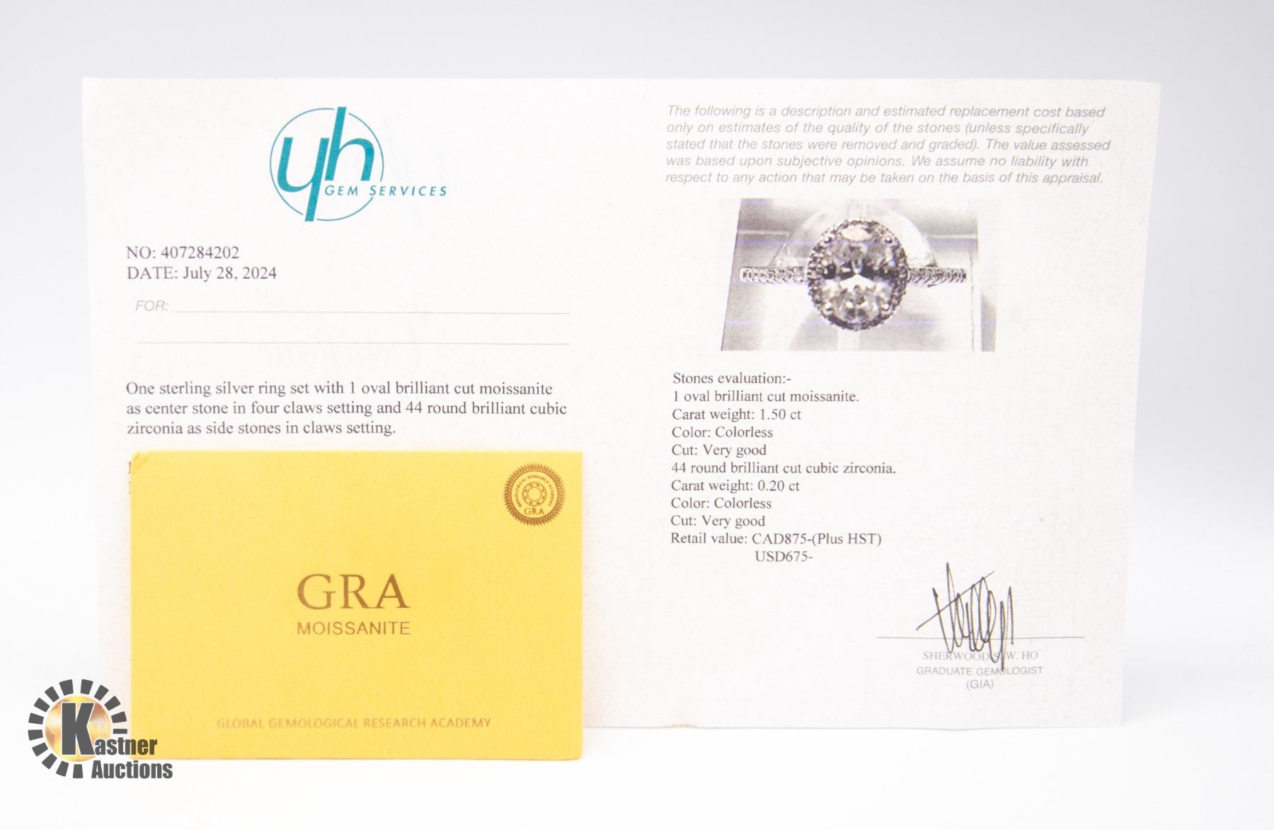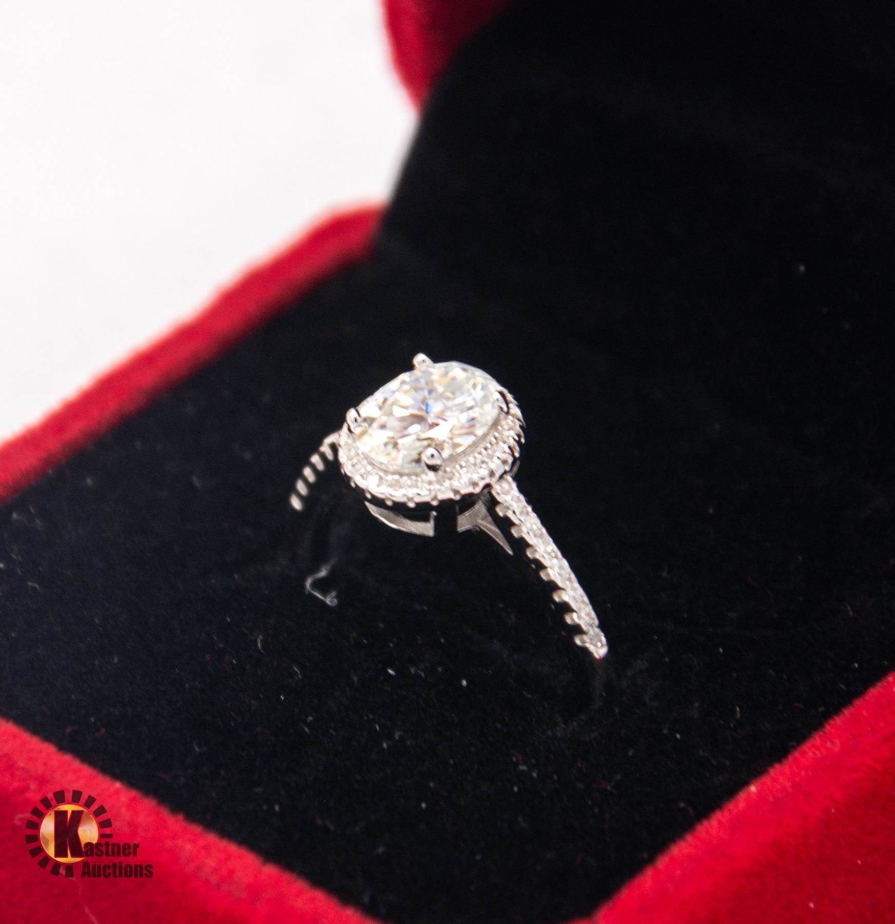 BRILLIANT CUT MOISSANITE STONE D COLOR SET IN CENTER OF OVAL HALO SET IN 925 SILVER RING SIZE 6.5 **ALL ITEMS MUST BE REMOVED BY 5PM SATURDAY, NOVEMBER 23RD 2024. ALL REMAINING ITEMS WILL BE SUBJECT TO A $6.00 PER DAY STORAGE CHARGE. ANY ITEMS REMAINING AFTER MONDAY, DECEMBER 9TH 2024 WILL BE CONSIDERED FORFEITED. NO REFUNDS WILL BE ISSUED FOR FORFEITED ITEMS. TO SCHEDULE A PICK UP APPOINTMENT CLICK HERE