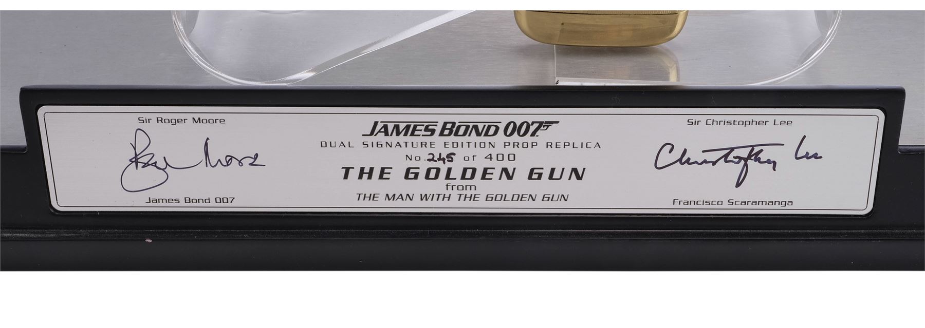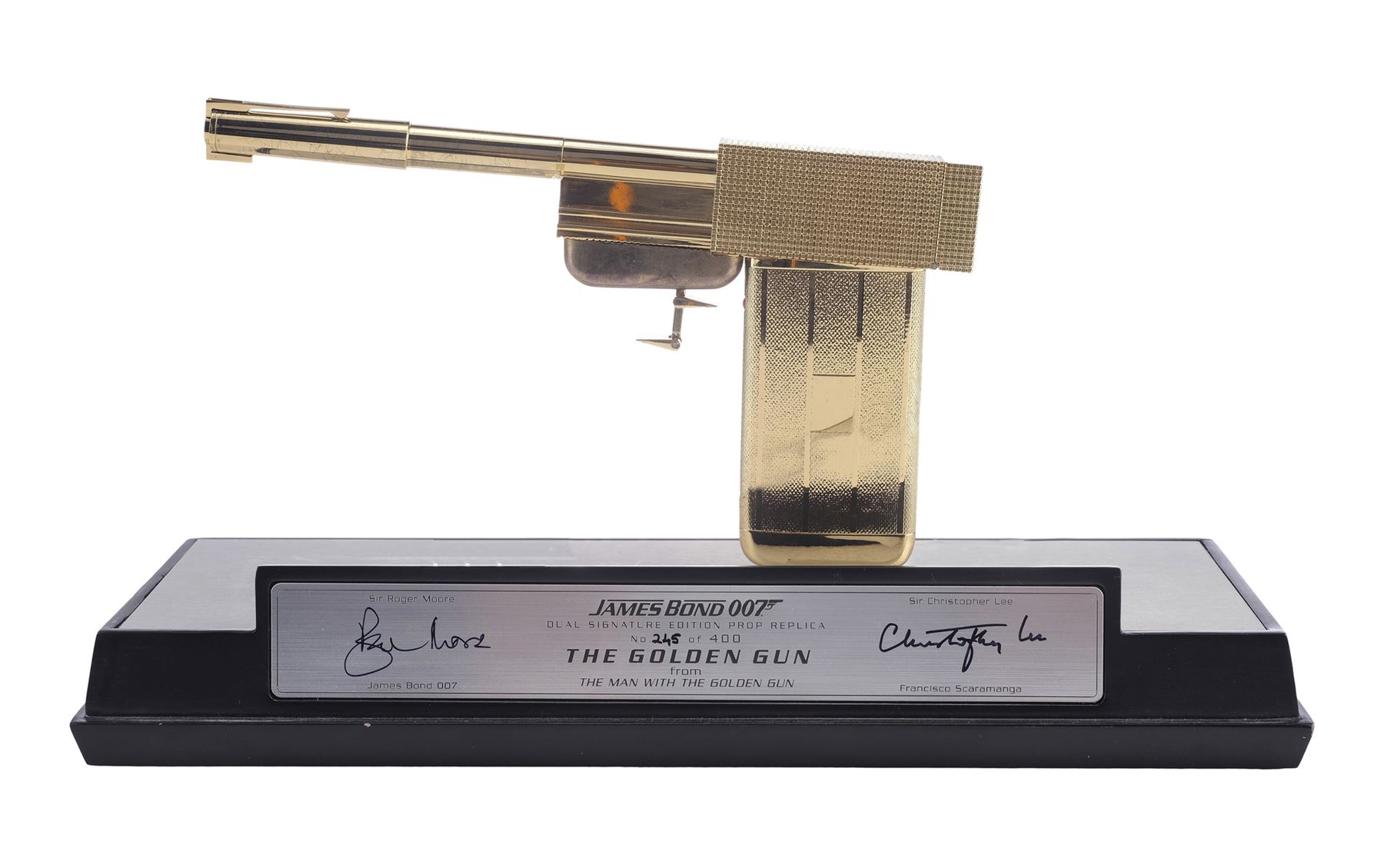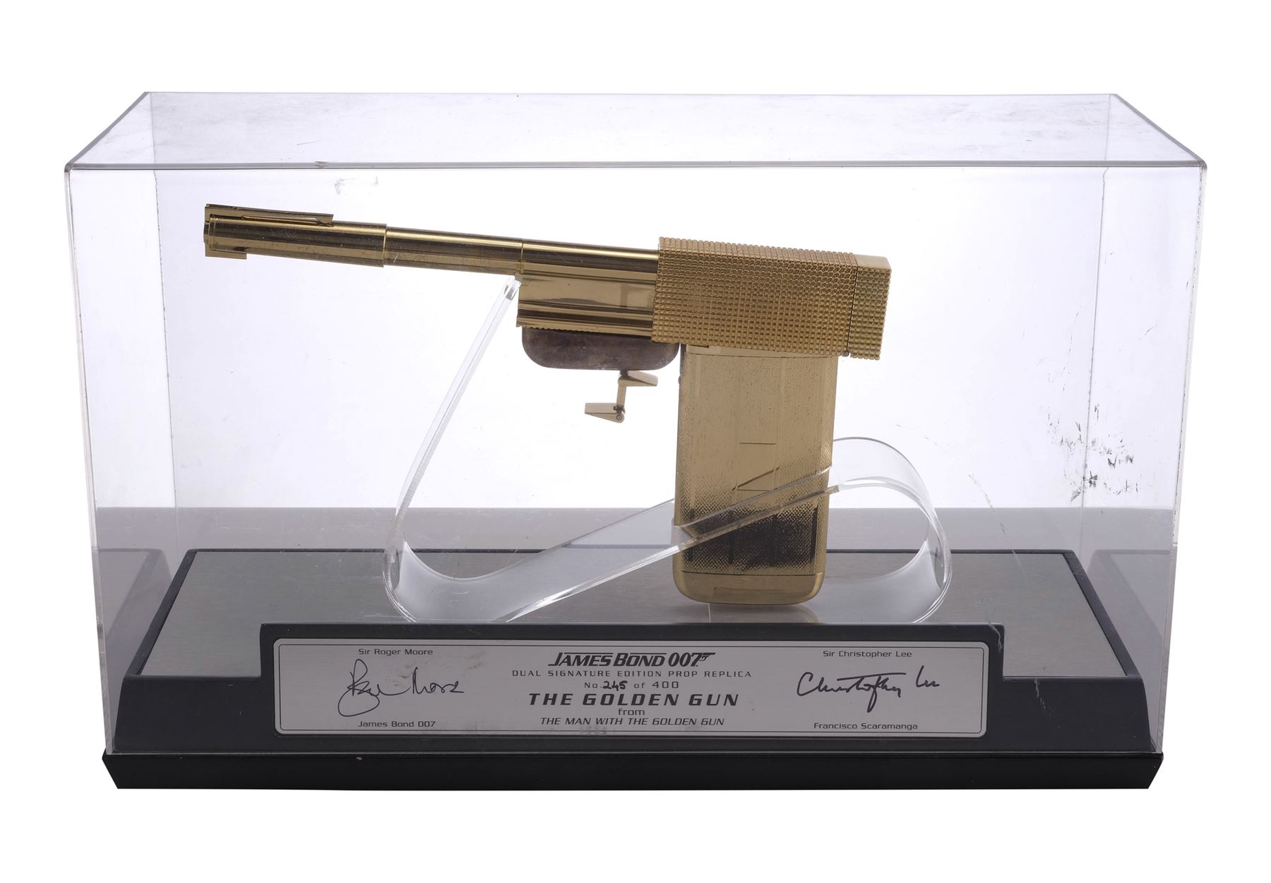 This gold-plated replica, limited to 400 worldwide, features a flexible cuff-link trigger, an unscrewable barrel, and a hinged hammer. It comes with an engraved "007" metal magazine with an exposed bullet. The lot also includes a plastic stand and a wooden display base, which features a plaque numbered "245" and the autographs of Lee and Roger Moore in black pen; and a collectibles magazine. The lot exhibits discoloration, paint wear and scuffing to the display. Dimensions : 14.5" x 5.5" x 9" (37 cm x 14 cm x 23 cm)
