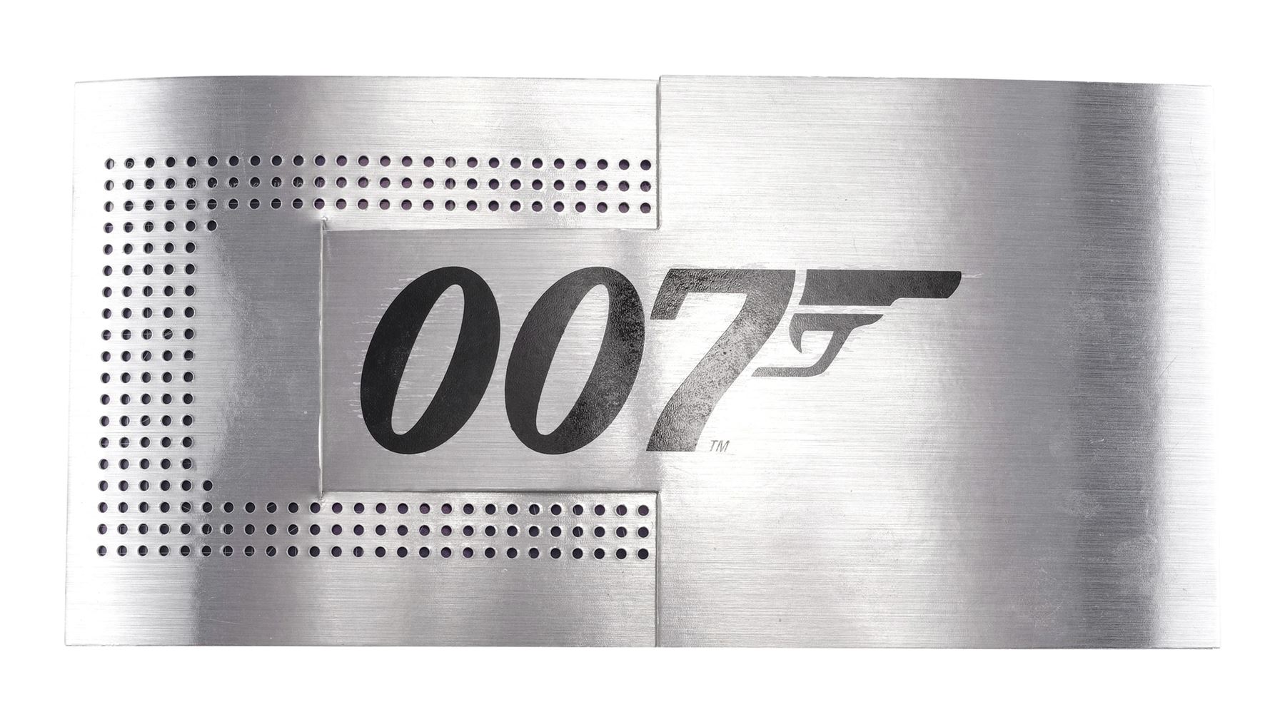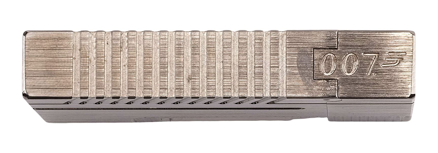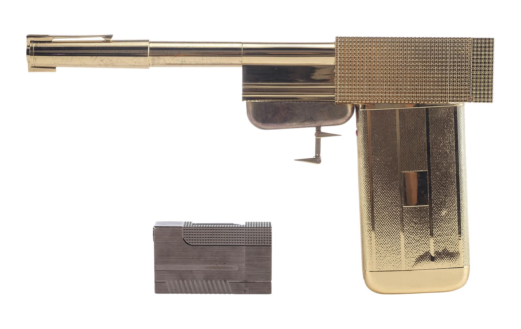 This gold-plated replica, limited to 400 worldwide, features a flexible cuff-link trigger, an unscrewable barrel, and a hinged hammer. It comes with an engraved "007" metal magazine with an exposed bullet. The lot also includes a plastic stand and a wooden display base, which features a plaque numbered "245" and the autographs of Lee and Roger Moore in black pen; and a collectibles magazine. The lot exhibits discoloration, paint wear and scuffing to the display. Dimensions : 14.5" x 5.5" x 9" (37 cm x 14 cm x 23 cm)