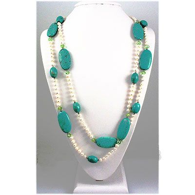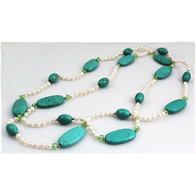1025.50ct Pretty Turquiose and FreshWater Pearls Neckla **|**|** 31" Fashionable Turquiose, Freshwater Pearls and Lemon Green Beads Necklace, Silk/Nylon thread ; MSRP: $300