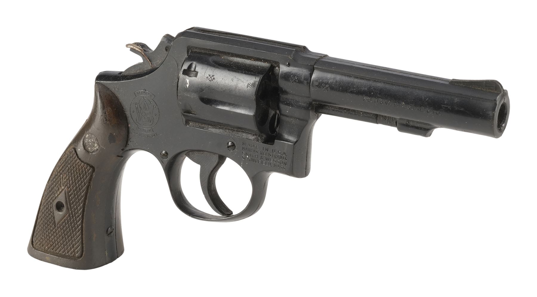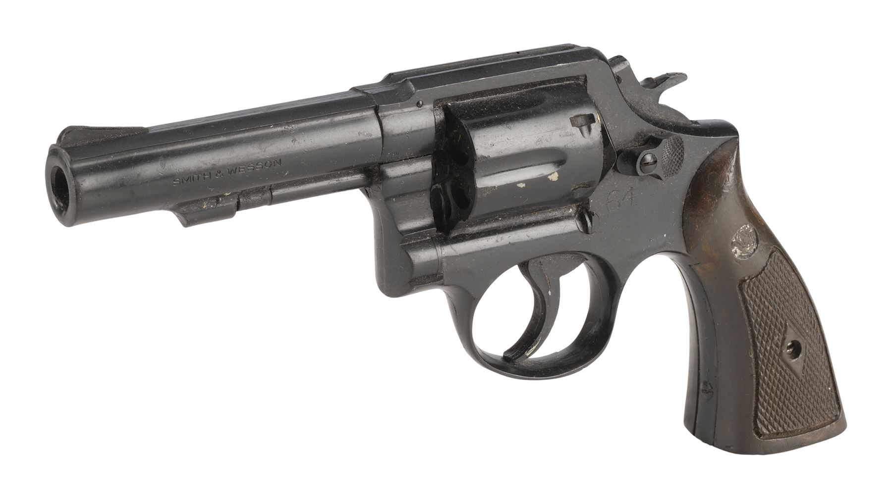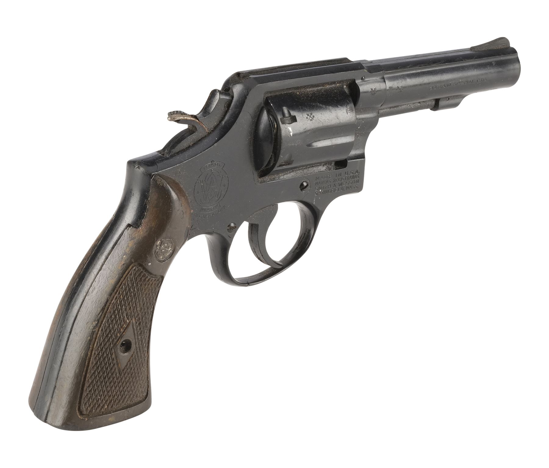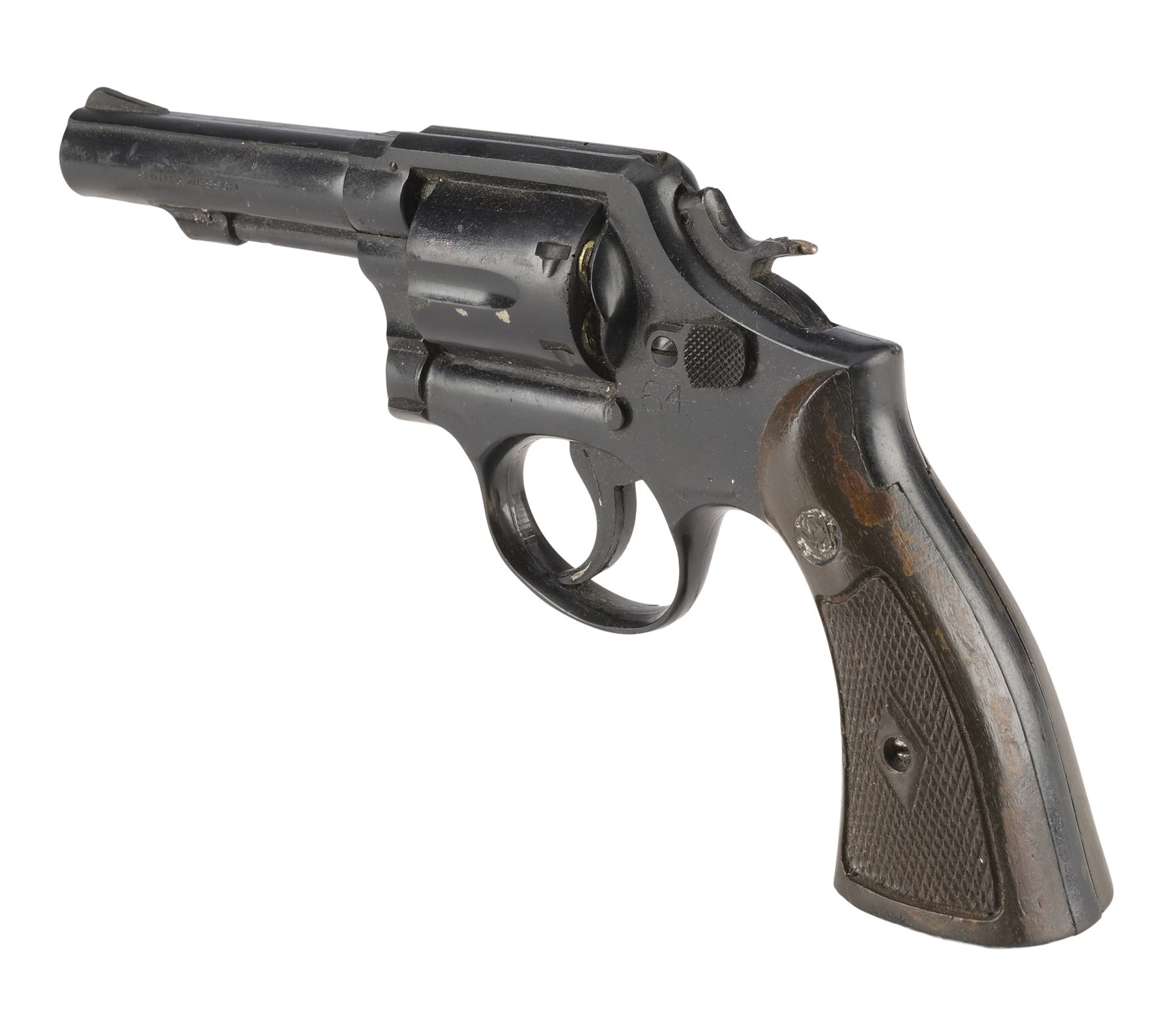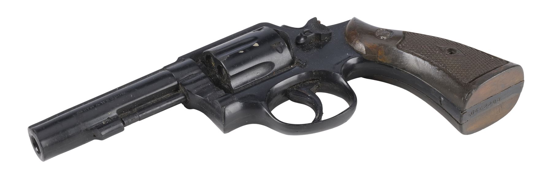 This lot consists of a black dense rubber revolver, modeled after a Smith & Wesson Model 10 HB, built around a metal core and featuring brown grips that resemble wood. It exhibits some grime, scuffing, and paint chipping from use and age, as well as chips in the rubber exposing the metal interior in the hammer. Dimensions: 9" x 5" x 1.5" (23 cm x 12.75 cm x 4 cm)