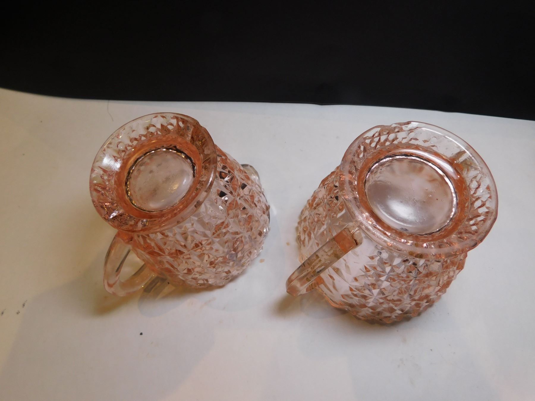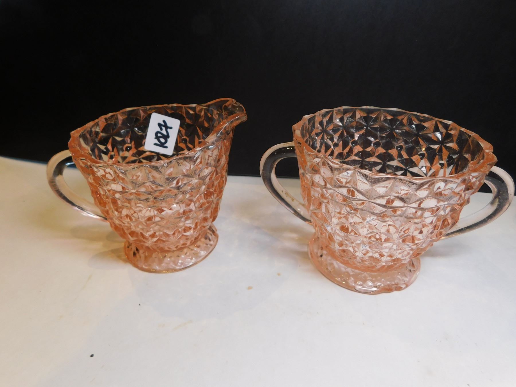 1027. DEPRESSION ERA, JEANNETTE GLASS, BUTTON AND BOW, CREAM AND SUGAR SMALL,CHIP ON BASE