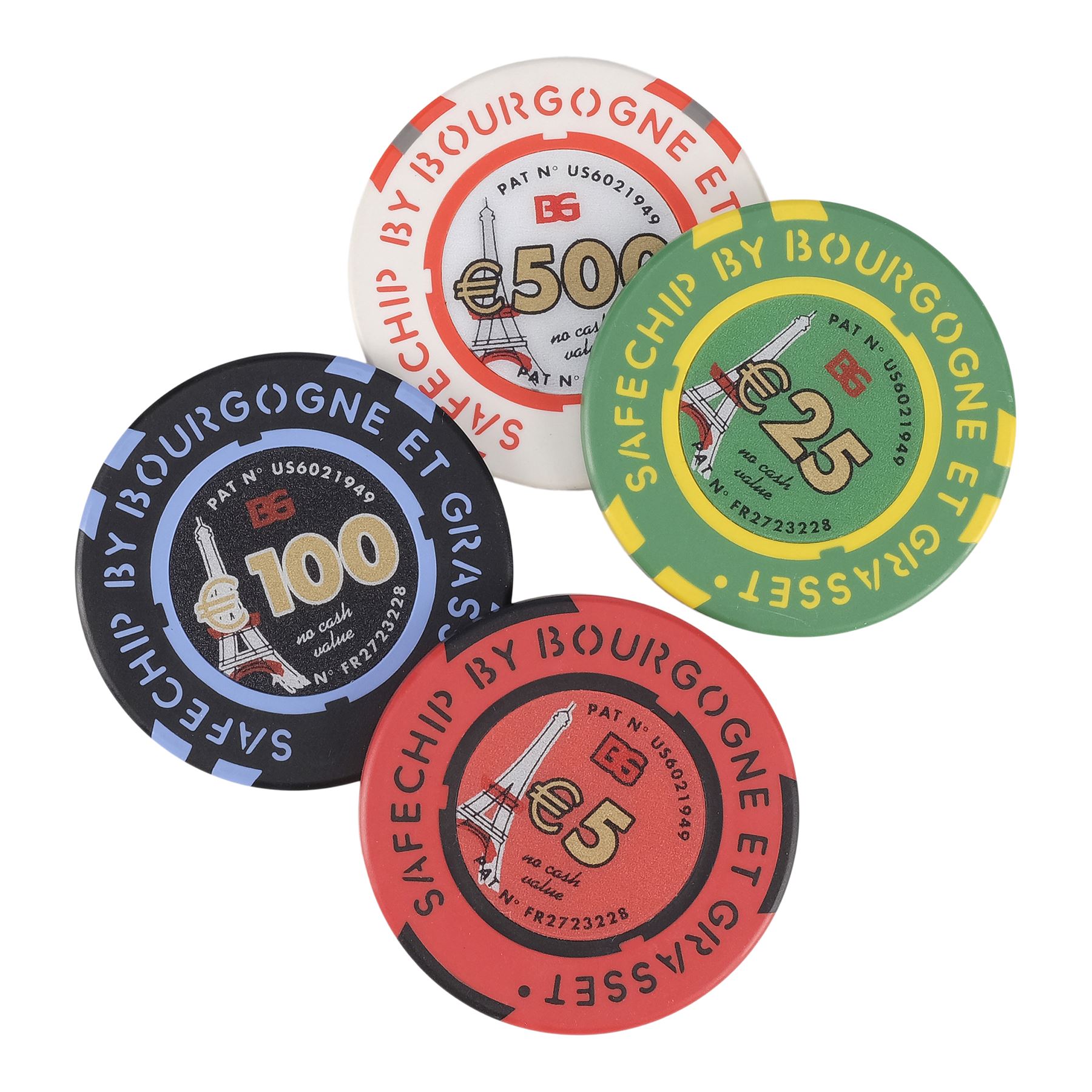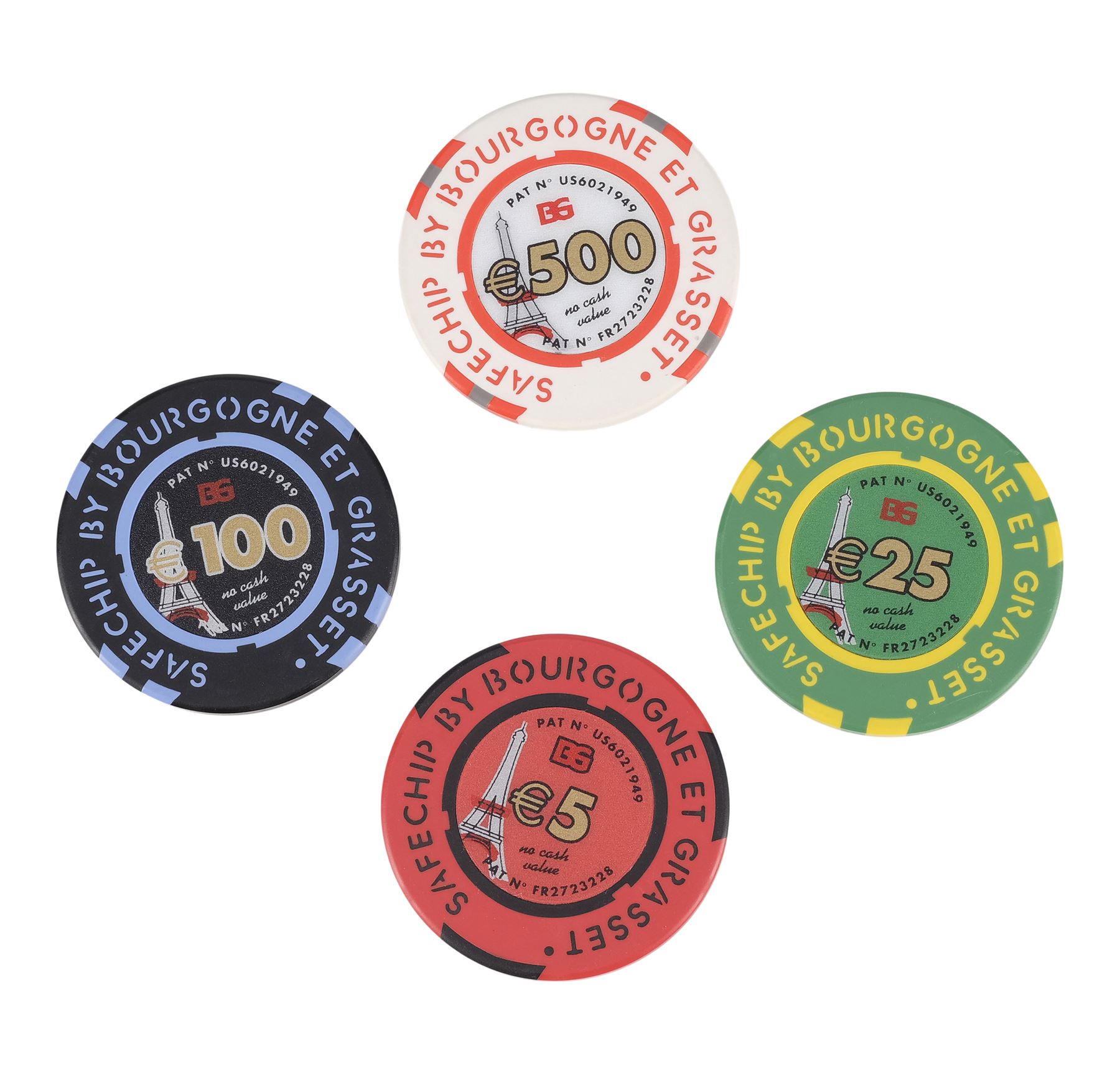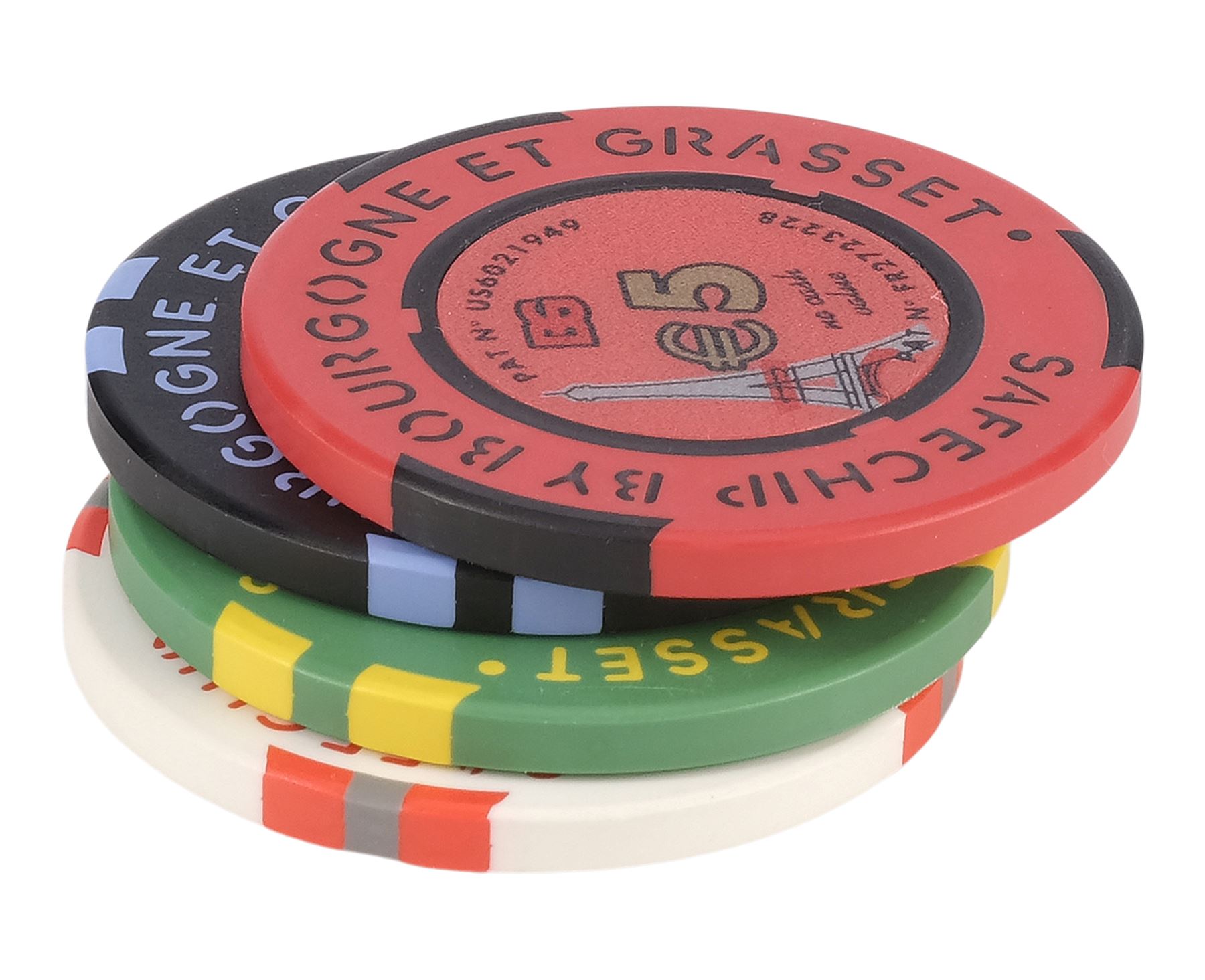 This set consists of one red and black & #163;5 chip; one green and yellow & #163;25 chip; one blue and black & #163;100 chip; and one red and white & #163;500 chip. Each clay chip is labeled "Safechip by Bourgogne Et Grasset." The chips exhibit minor scuffs and scratches from use and age. Dimensions: (each) 1.5" x 1.5" x 0.25" (4 cm x 4 cm x 0.75 cm)