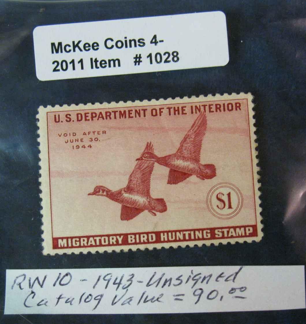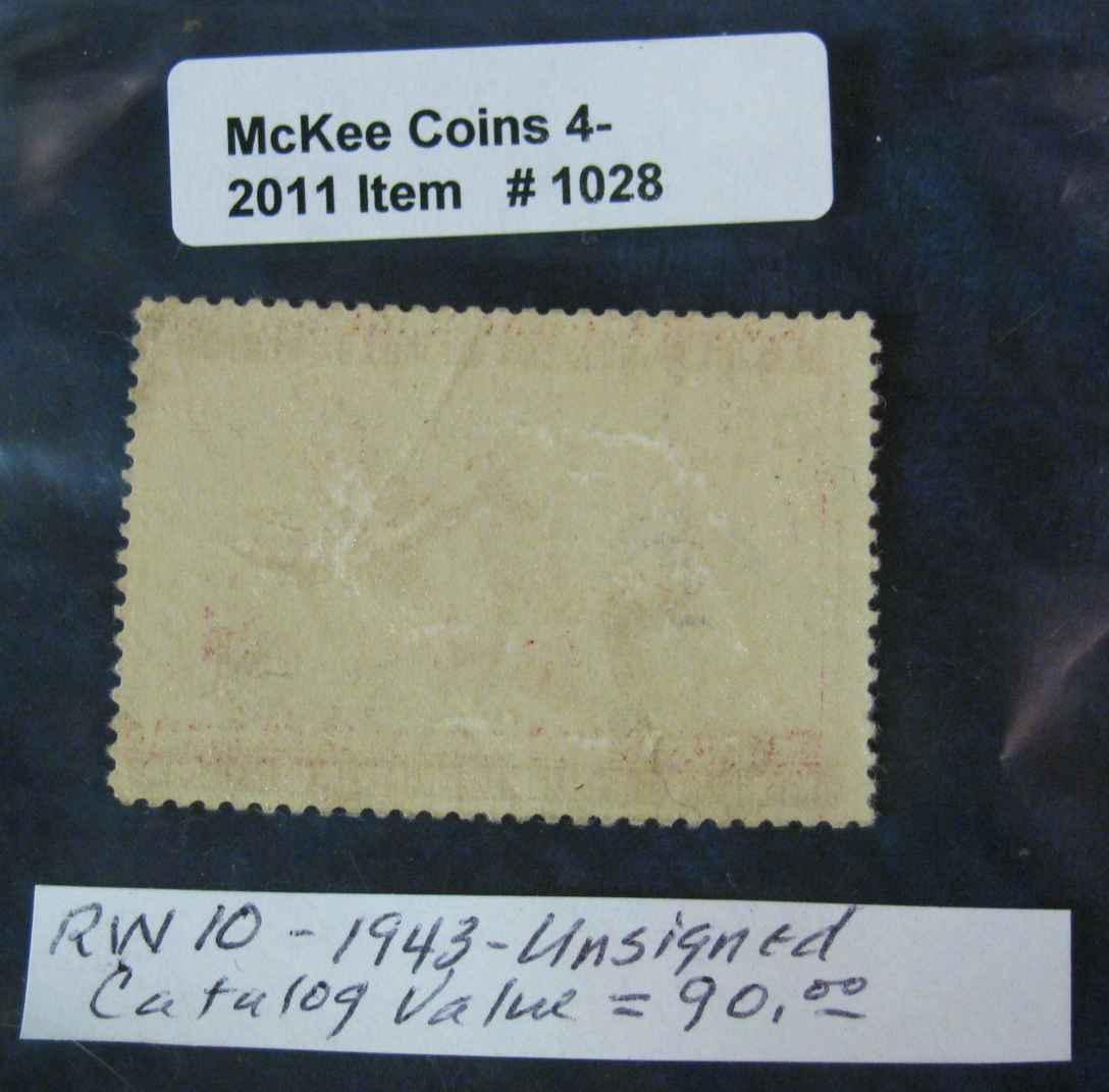1028. RW-10 1943 Unsigned Duck Stamp Full Gum. Cat. Value $90.00