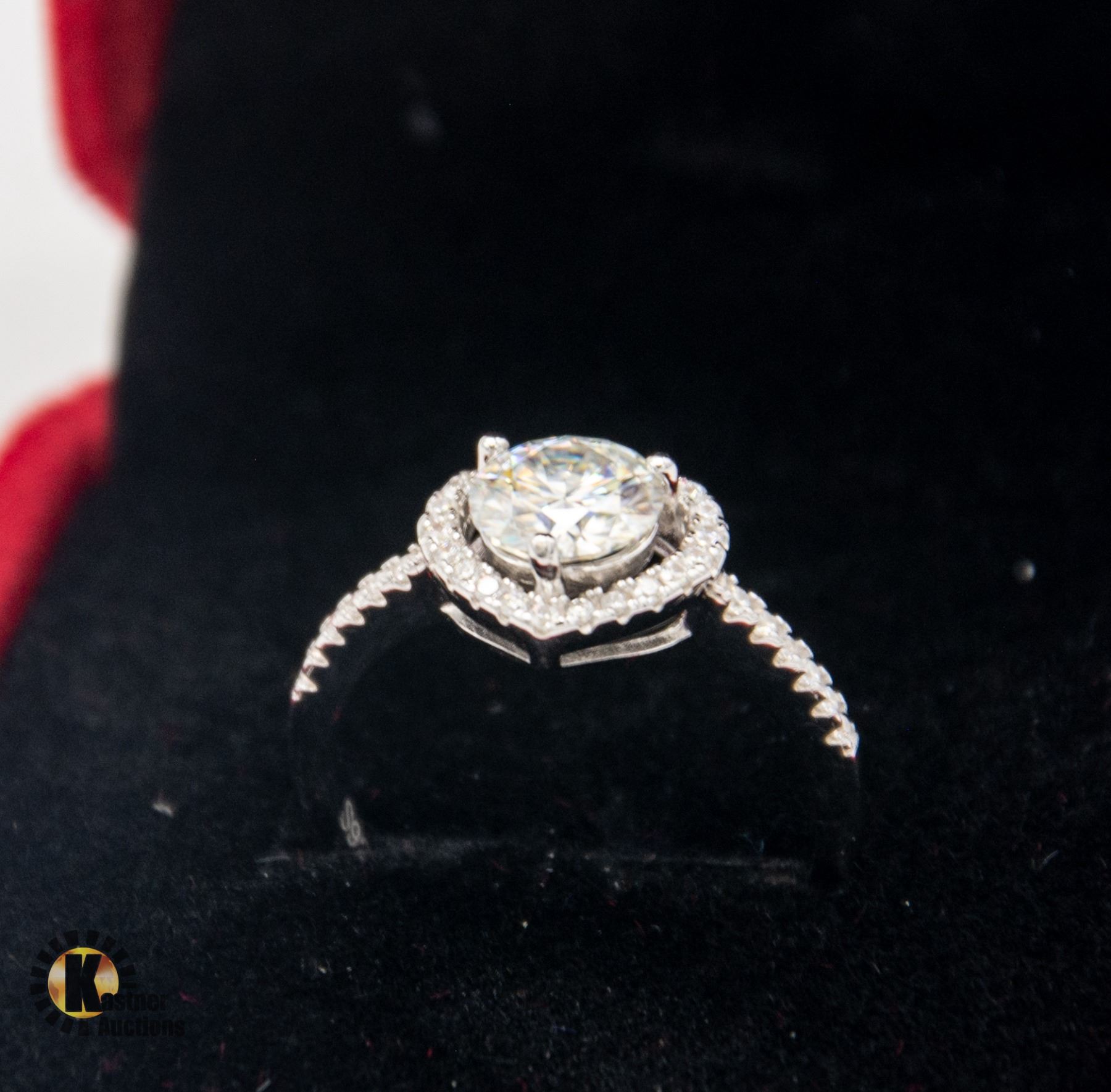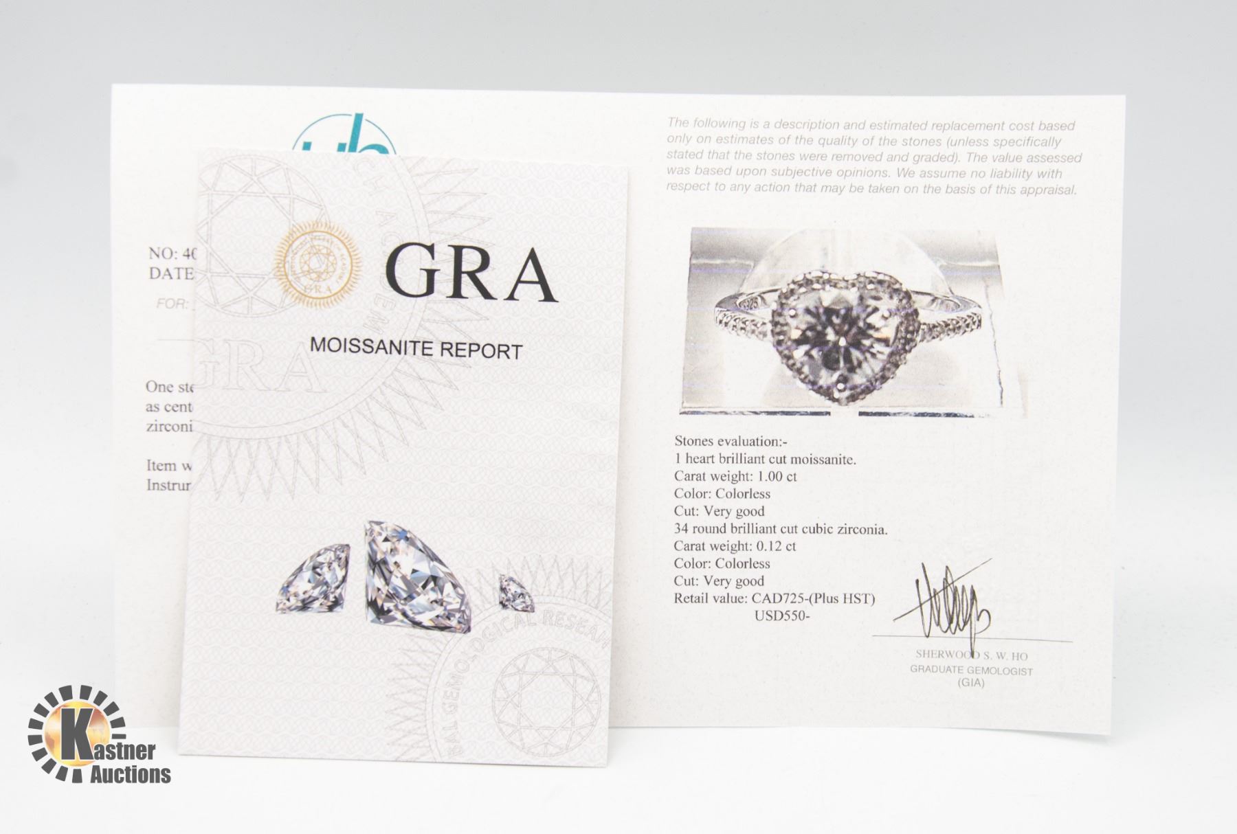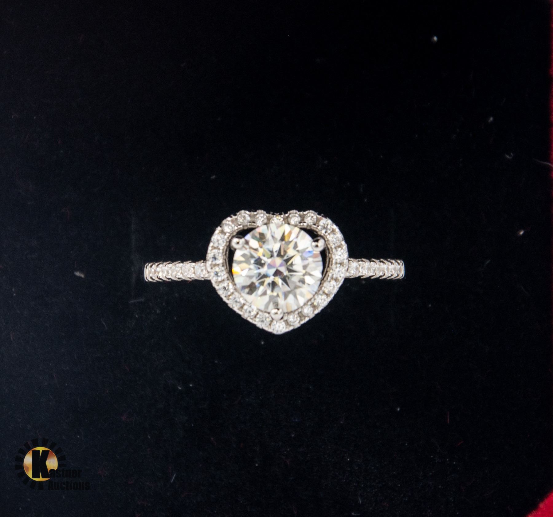 MOISSANITE STONE VVS D COLOR WITH 34 ROUND BRILLIANT CUT CUBIC ZIRCONIA SET IN HEART SHAPED HALO AND IN SHANKS SET IN 925 SILVER RING SIZE 6