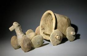 Syria, ca. 1000 to 800 BC. Delightful child's toy in the form of a covered cart and horse - each with original four wheels. Wheels once applied using wooden dowels which have been lost to age. Entire unit measures 9"L x 4-1/2"H.